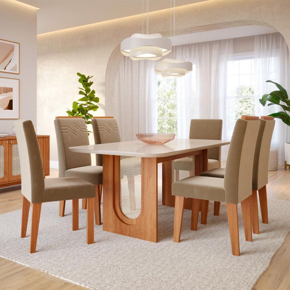 Conjunto de Mesa Retangular com Tampo de Vidro Off White Valentina e 6 Cadeiras Tais e Maia Suede Joli e Amadeirado