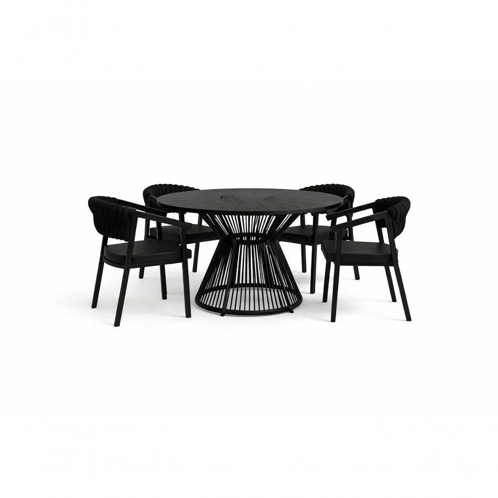 Conjunto Eclipse alumínio náutico 4 Cadeiras Metal Art.O Conjunto Eclipse é a união perfeita entre design contemporâneo, resistência e sofisticação. Desenvolvido para ambientes que exigem estética marcante e alta durabilidade, ele se destaca pelo visual escultural e pelos materiais nobres, ideais tanto para áreas internas quanto externas.A mesa redonda possui tampo em alumínio ripado, conferindo elegância, leveza visual e excelente resistência às variações climáticas. Sua base é um verdadeiro destaque de design, com estrutura em alumínio combinada à corda náutica, formando um conjunto moderno, imponente e extremamente estável.As cadeiras seguem a mesma proposta de alto padrão, com estrutura em alumínio e encosto em tricô náutico, que proporciona conforto, ergonomia e um acabamento sofisticado, além de ser um material durável e fácil de manter.Ideal para salas de jantar, áreas gourmet, varandas, espaços externos, jardins e áreas de lazer, o Conjunto Trama transforma qualquer ambiente em um espaço elegante e acolhedor.Diferenciais do produto Estrutura totalmente em alumínio Tampo ripado em alumínio Base da mesa em alumínio com corda náutica Cadeiras em alumínio com tricô náutico Design contemporâneo e escultural Alta durabilidade e resistência Fácil manutenção e limpezaFaz parte do anúncio:1 Mesa Eclipse alumínio , tampo aluminio 1,20 metros04 Cadeiras Eclipse , alumínio, tricô náutico.Obs.: Não acompanha objetos decorativos.Dimensões da Mesa:Altura: 80 centímetrosDiâmetro: 1,20 metrosDimensões do cadeira:Altura: 88 CentímetrosLargura: 51 CentímetrosProfundidade: 50 CentímetrosInformações Importantes:- Produtos podem apresentar diferenças de tonalidades entre a foto na tela e o produto real, devido a calibração de cor de tela.- Limpar com flanela ou pano macio. Não utilizar álcool. Não utilizar produtos abrasivos ou corrosivos.- Nós prezamos pela qualidade da entrega em primeiro lugar, trabalhamos com transportadoras altamente selecionadas e os melhores materiais de embalagem.- Todos os itens já vão embalados a mesa vai semi montada. Não necessita da montagem de um profissional, ficando ao critério do cliente.- Não responsabilizamos pela montagem.- Certifique-se de que o produto caiba em elevadores e vãos de escadas, não fazemos içamentos ou desmontagens de produtos. Quaisquer despesas deste tipo ficam a cargo do cliente.- Garantia de 3 meses contra defeitos de fabricação.