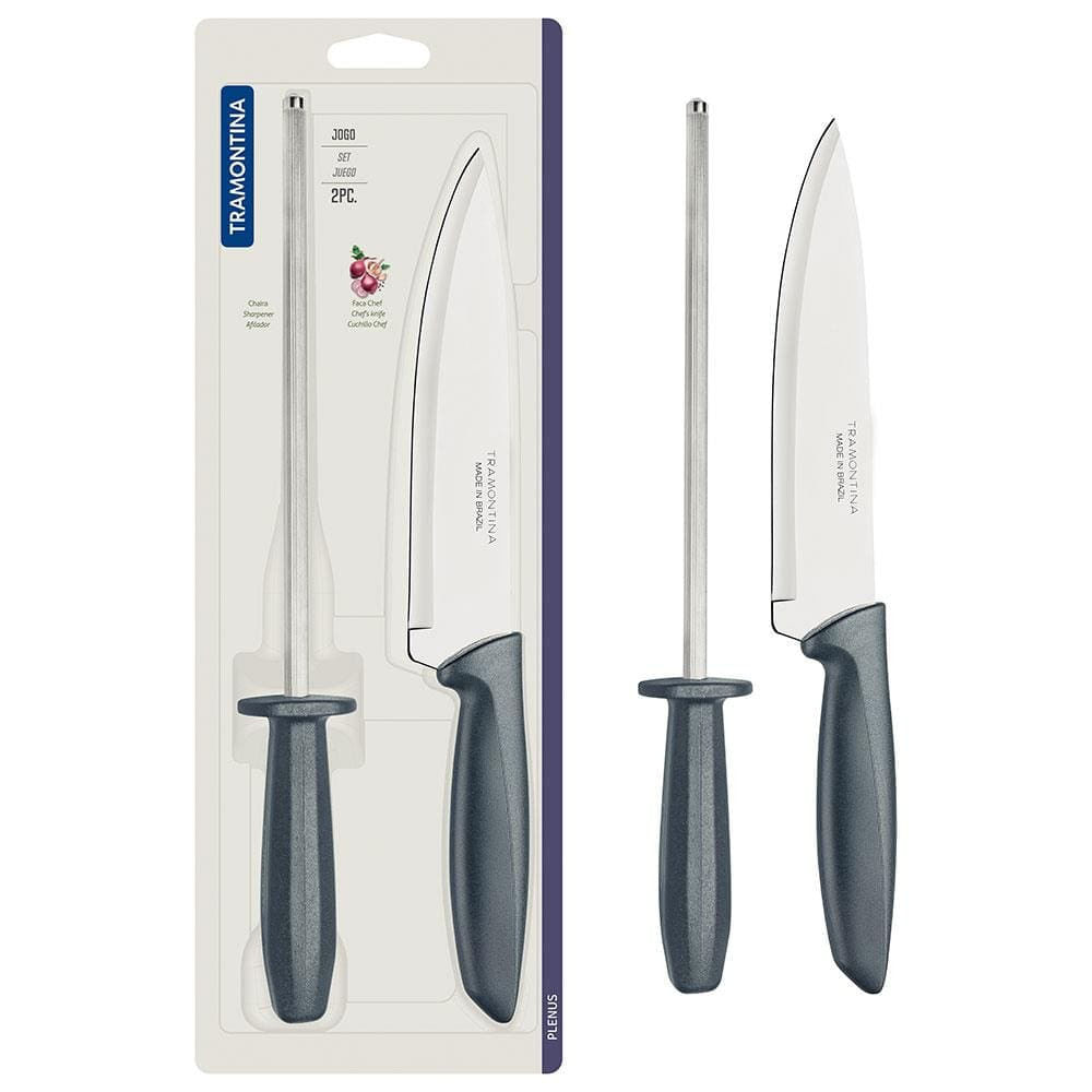 Conjunto Faca Chef e Chaira Plenus 2 Peças Tramontina Cinza com inox
