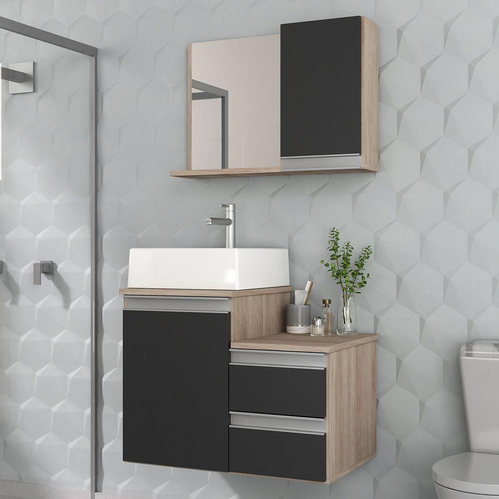 Conjunto Gabinete Banheiro Cross 60 (gabinete+espelheira+cuba) Madeirado Preto