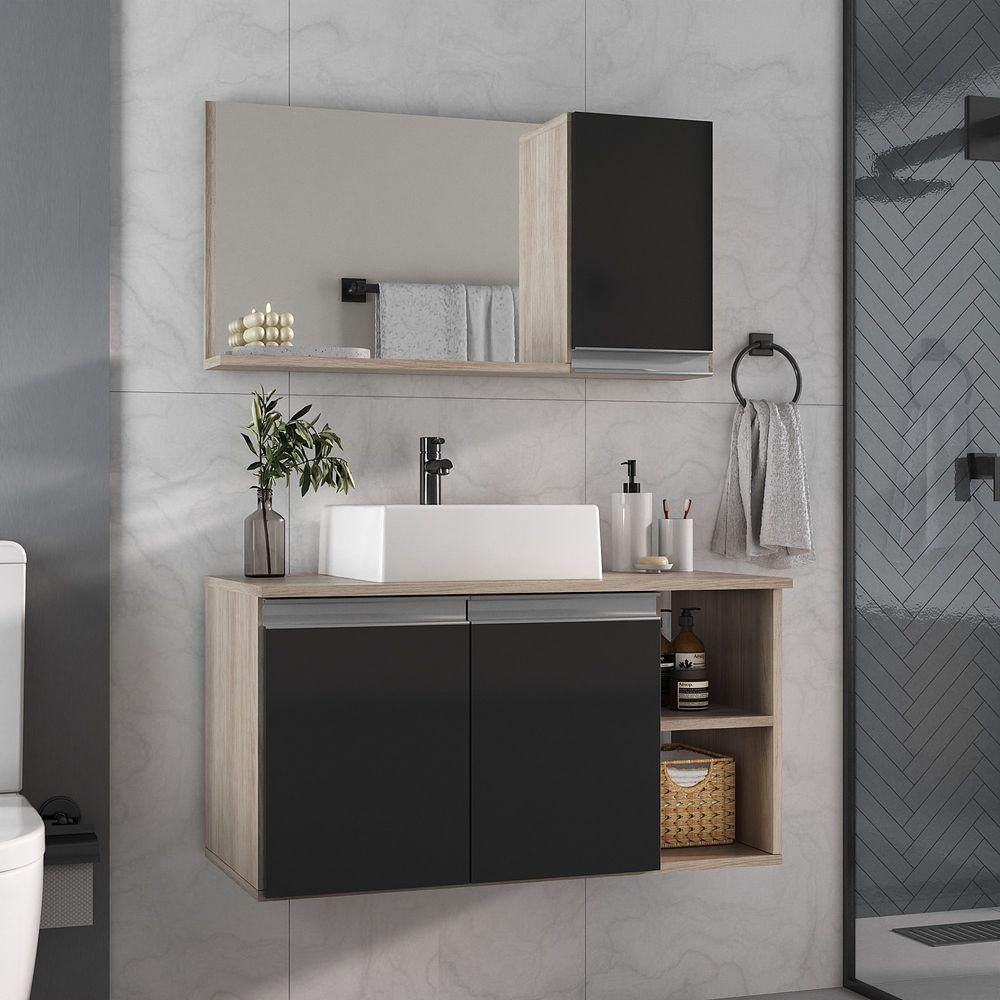 Conjunto Gabinete Banheiro Virtus 80cm - Gabinete + Cuba + Espelheira Madeirado Preto