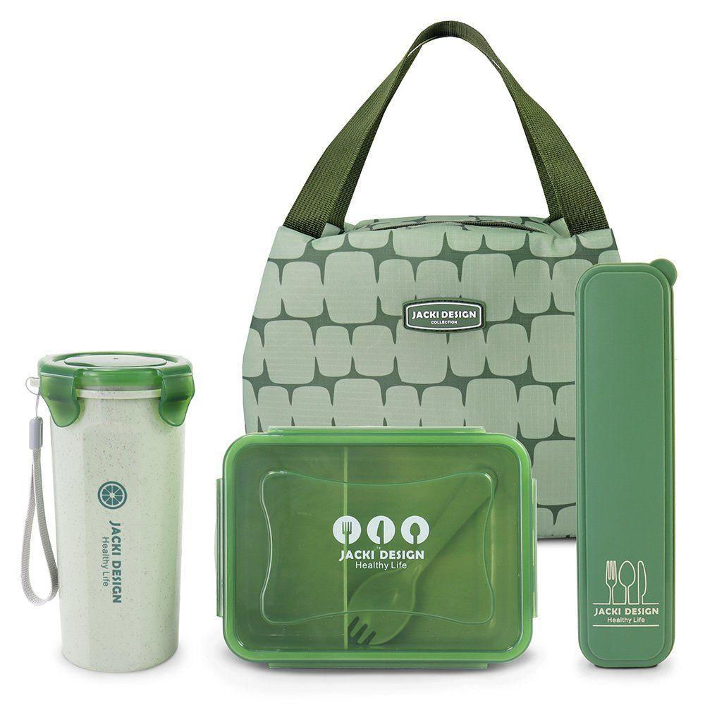 Conjunto Kit Fitness de 3 peças e Porta talheres Portátil Cor Verde - Montamos esse Kit Exclusivo da linha Elementos especialmente para você!Kit Fitness de 3 Pçs Elementos:O Kit Fitness de 4 peças da coleção ELEMENTOS inclui: uma bolsa térmica (7430ml), pote para marmita (1050 ml), garrafa com tampa (500 ml) e garfo. A bolsa térmica da Jacki Design é feita multicamadas e folha de alumínio para manter seu alimento fresco e bem conservado. Possui fecho em zíper e alça de mão. A garrafa, marmita e garfo são feitos de 30% de trigo, livres de BPA, e com qualidade Jacki Design. Ideal para levar comida para o trabalho, escola e passeios. (INSTRUÇÕES DE USO: Retire a tampa antes de levar ao micro-ondas; usar somente para aquecer comida, não para cozinhar; Temperatura de uso: -20°C ~120°C; Limpe usando uma esponja macia e detergente).Garrafa: Comprimento 9,2cm x Largura 8,5cm x Altura 17cm Marmita: Comprimento 17,7cm x Largura 13,4cm x Altura 6,8cm Bolsa Térmica: Comprimento 23cm x Largura 17cm x Altura 19cmPorta Talheres Portátil Jacki Design:Porta Talheres Portátil:O Porta Talheres da Jacki Design é um item essencial para transportar com higiene e segurança seus talheres. Feita de material Polipropileno, ele é compacto e fácil de limpar. Conheça a linha completa da coleção JOY e complete o seu kit!Medidas: Comprimento: 25cm x Largura: 6cm x Altura: 3cm