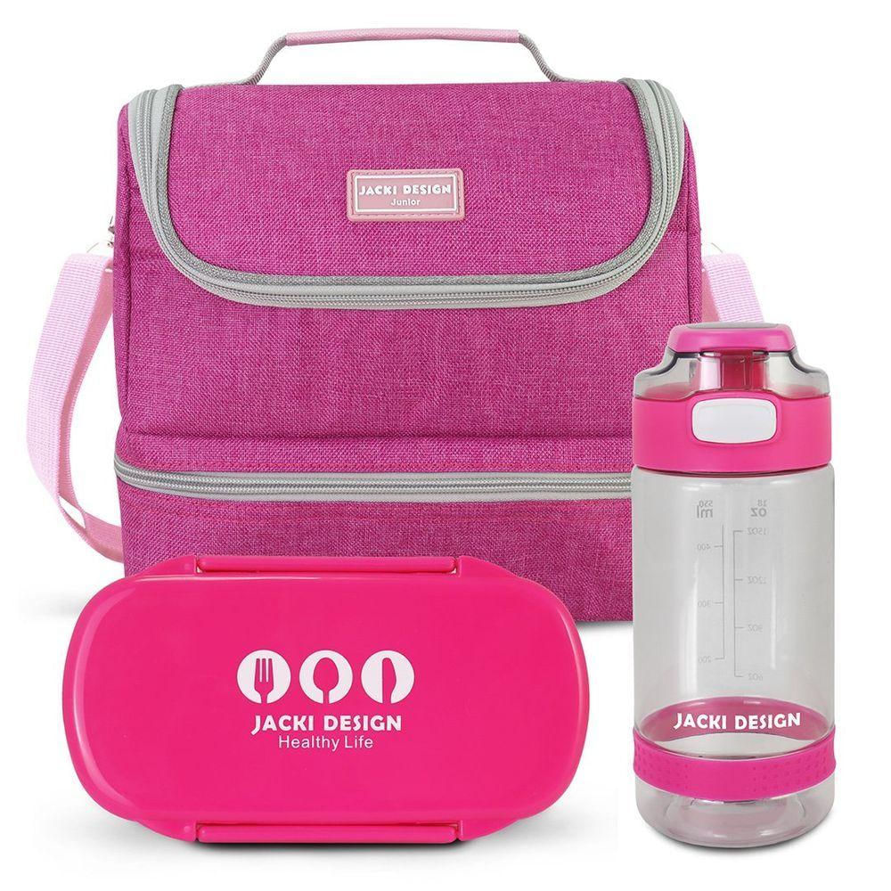 Conjunto Lancheira Térmica com Pote p/ Lanche 450ml e Garrafa 550ml Pink -A Lancheira térmica de 2 compartimentos da coleção Júnior foi criada pensando nos jovens estudantes, perfeito para crianças ou até para os pré-adolescentes. Possui alça de mão, alças ajustáveis, folhas de alumínio na parte interna conservando os alimentos frescos por mais tempo. É ideal para passeios, viagens ou escola. Conheça a linha completa da coleção JÚNIOR e complete o seu kit! CUIDADOS GERAIS: Limpe a bolsa térmica com um pano úmido. Caso necessário, use sabão neutro ou álcool para higienizar o local. Deixe secar na sombra. ATENÇÃO: Para preservar a vida útil do produto, recomendamos não deixar a bolsa de molho, não levar a máquina de lavar e também não utilizar produtos químicos.Medidas: Comprimento: 22cm x Largura: 12cm x Altura: 18cmA Lancheira térmica de 2 compartimentos da coleção Júnior foi criada pensando nos jovens estudantes, perfeito para crianças ou até para os pré-adolescentes. Possui alça de mão, alças ajustáveis, folhas de alumínio na parte interna conservando os alimentos frescos por mais tempo. É ideal para passeios, viagens ou escola. Conheça a linha completa da coleção JÚNIOR e complete o seu kit! CUIDADOS GERAIS: Limpe a bolsa térmica com um pano úmido. Caso necessário, use sabão neutro ou álcool para higienizar o local. Deixe secar na sombra. ATENÇÃO: Para preservar a vida útil do produto, recomendamos não deixar a bolsa de molho, não levar a máquina de lavar e também não utilizar produtos químicos.Medidas: Comprimento: 22cm x Largura: 12cm x Altura: 18cmA Garrafa Squeeze de 550ml é ideal para levar água, suco ou chá para passeios ou escola. Possui bico, trava de segurança e alça de mão embutida na tampa. É leve e fácil de carregar. Produto com qualidade Jacki Design. Conheça a linha completa da coleção JÚNIOR e complete o seu kit! (INSTRUÇÕES DE USO: Não vai ao micro-ondas ou lava-louças; Temperatura de uso: -15°C ~50°C; Limpe usando uma esponja macia e detergente).Medidas: Comprimento: 7.5cm x Largura: 7.5cm x Altura: 18.2cm