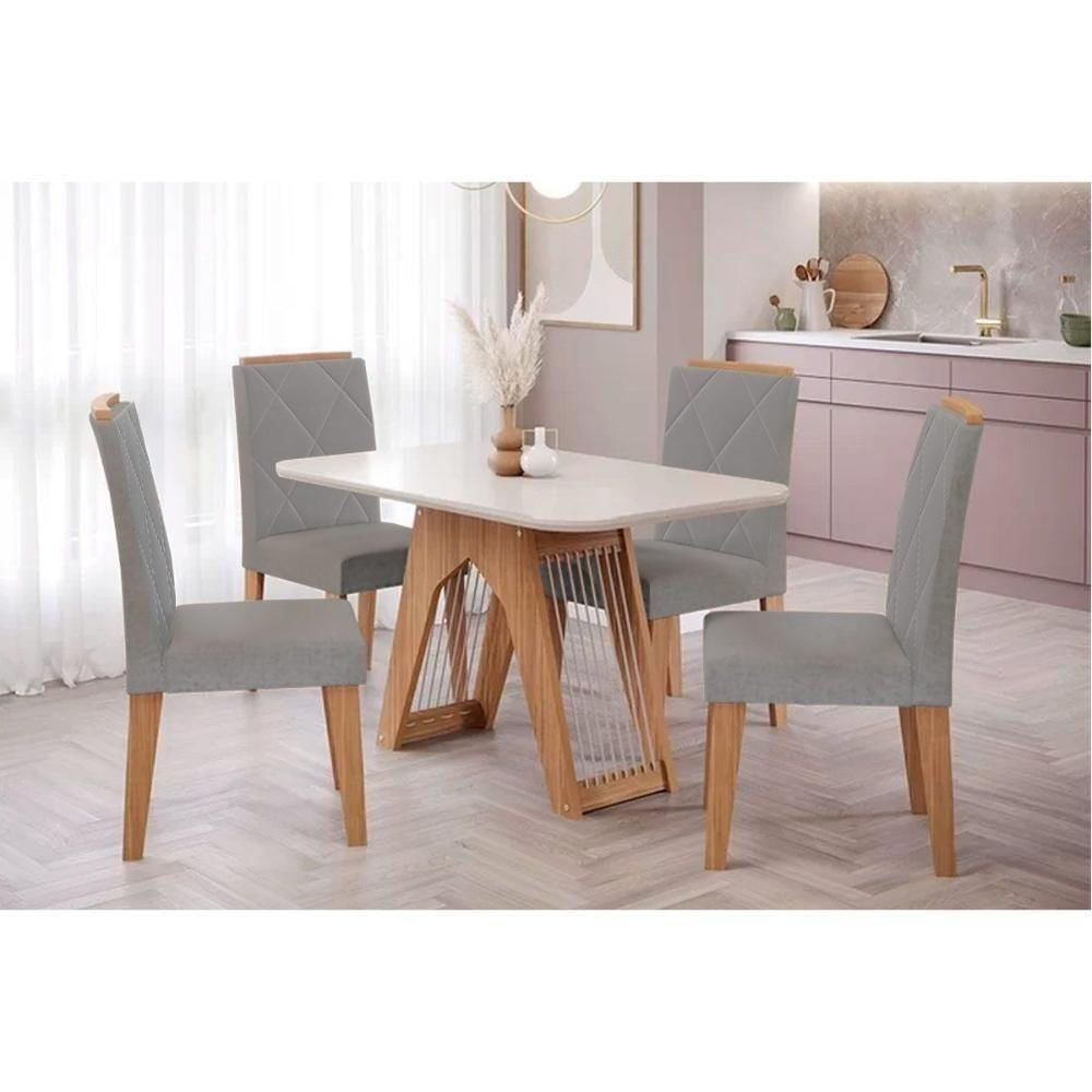 Conjunto Mesa De Cozinha Carol Tampo Madeirado Com Vidro 130x80cm E 4 Cadeiras Fernanda Madeirado Linho Grafite Cimol