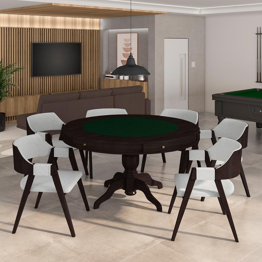 Conjunto Mesa de Jogos Carteado Bellagio Tampo Reversível Verde e 6 Cadeiras Madeira Poker Base Estrela Linho Cinza/Tabaco G42 - Gran Belo