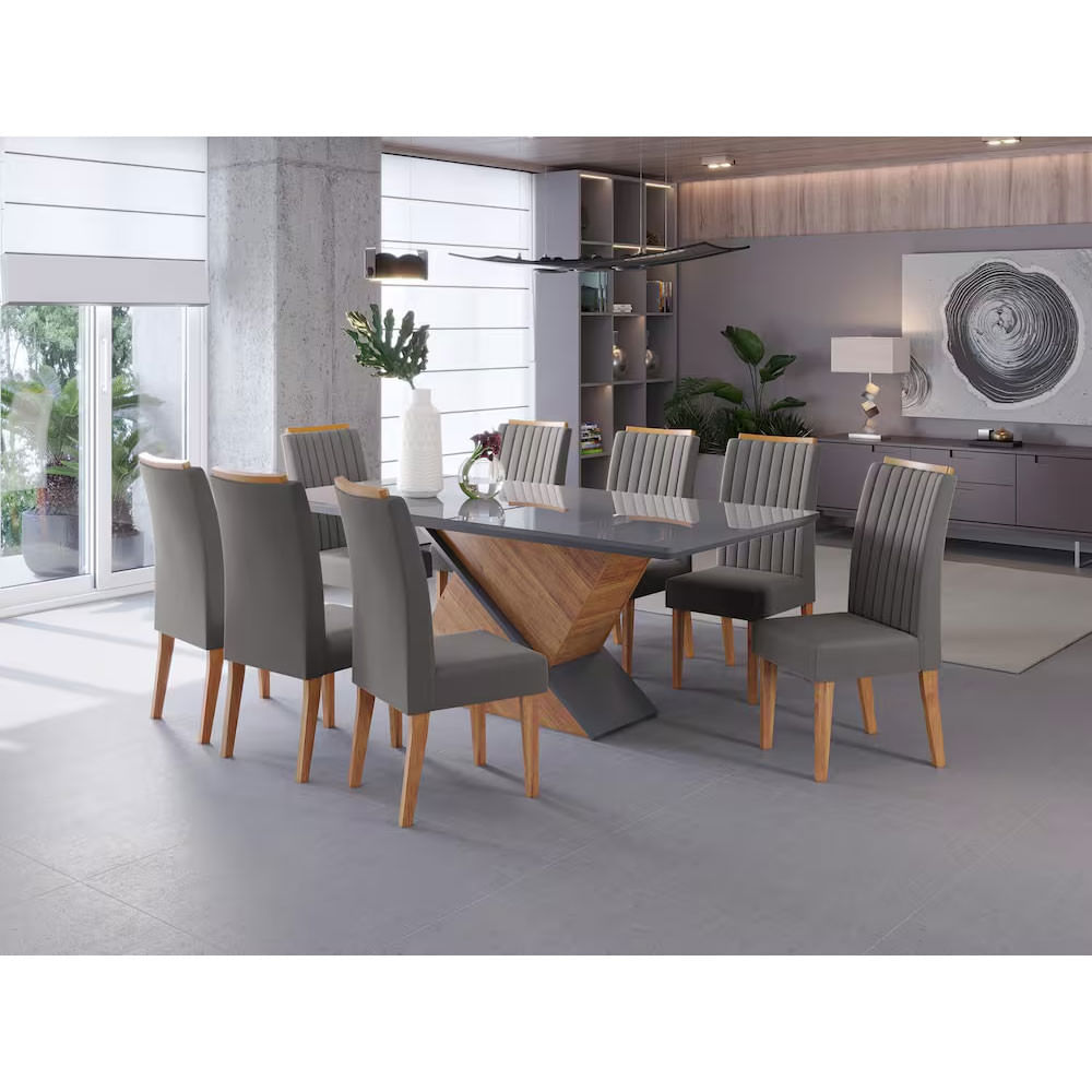 Com mesa retangular de 200x90cm, o modelo acomoda perfeitamente até oito pessoas e foi pensada para momentos em família ou encontros especiais. A mesa tem tampo com cantos arredondados é fabricado em MDF de 40mm, agregando robustez e beleza. Para um toque refinado e maior durabilidade, o tampo conta com vidro temperado de 4mm sobreposto.
