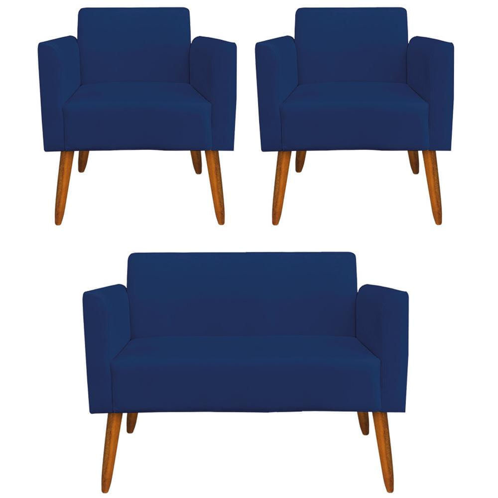 Conjunto Namoradeira e 2 Poltronas Decorativas Isabella Pés Palito Madeira Suede Azul Marinho - Gran Belo
