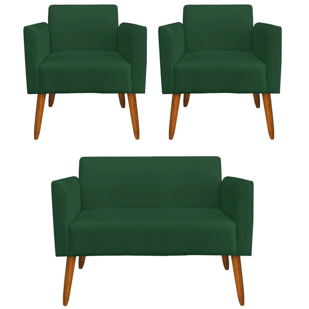 Conjunto Namoradeira e 2 Poltronas Decorativas Isabella Pés Palito Madeira Suede Verde - Gran Belo