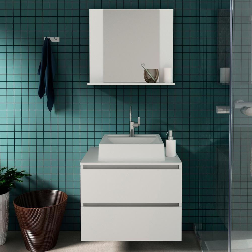 Conjunto Para Banheiro 03 Peças. Com design prático e funcional, estas peças entrega ao ambiente toques de modernidade e elegância. Possuem estruta em MDP de 15mm, e acabamento em pintura UV/BP. Composto por 02 gavetas com corrediças metálicas, 01 prateleira ideal para deixar seus itens mais utilizados sempre a mão. Cuba em mármore sintético e acabamento Brilho Polido, esta Cuba já vai com furação para intalação da torneira (torneira não inclusa). O mármore sintético combina alta resistência ao impacto e baixa porosidade, proporcionando maior impermeabilidade a manchas, o que garante a resistência e vitalidade do produto. Este conjunto é uma ótima escolha para manter seus produtos de higiene e beleza sempre organizados. Estes produtos chegarão na sua casa separados em 03 volumes.