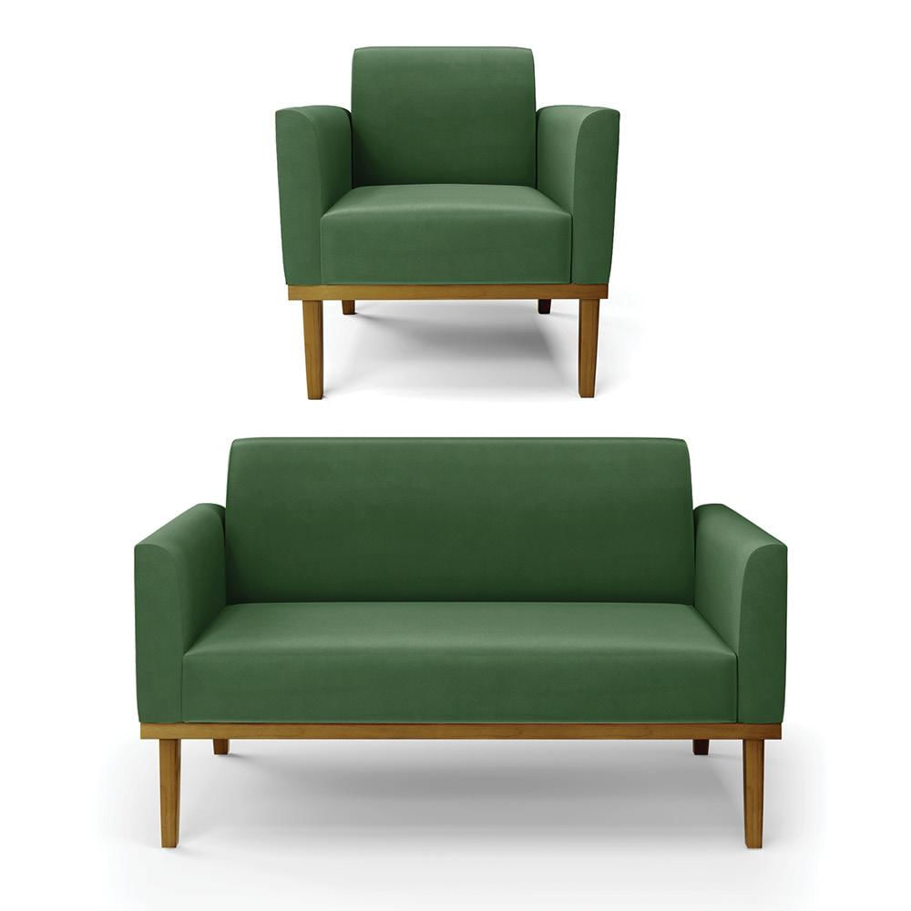 Conjunto Poltrona e Namoradeira Decorativa Isabella Pés Fixo em Madeira Castanho Suede Verde G19 - Gran Belo