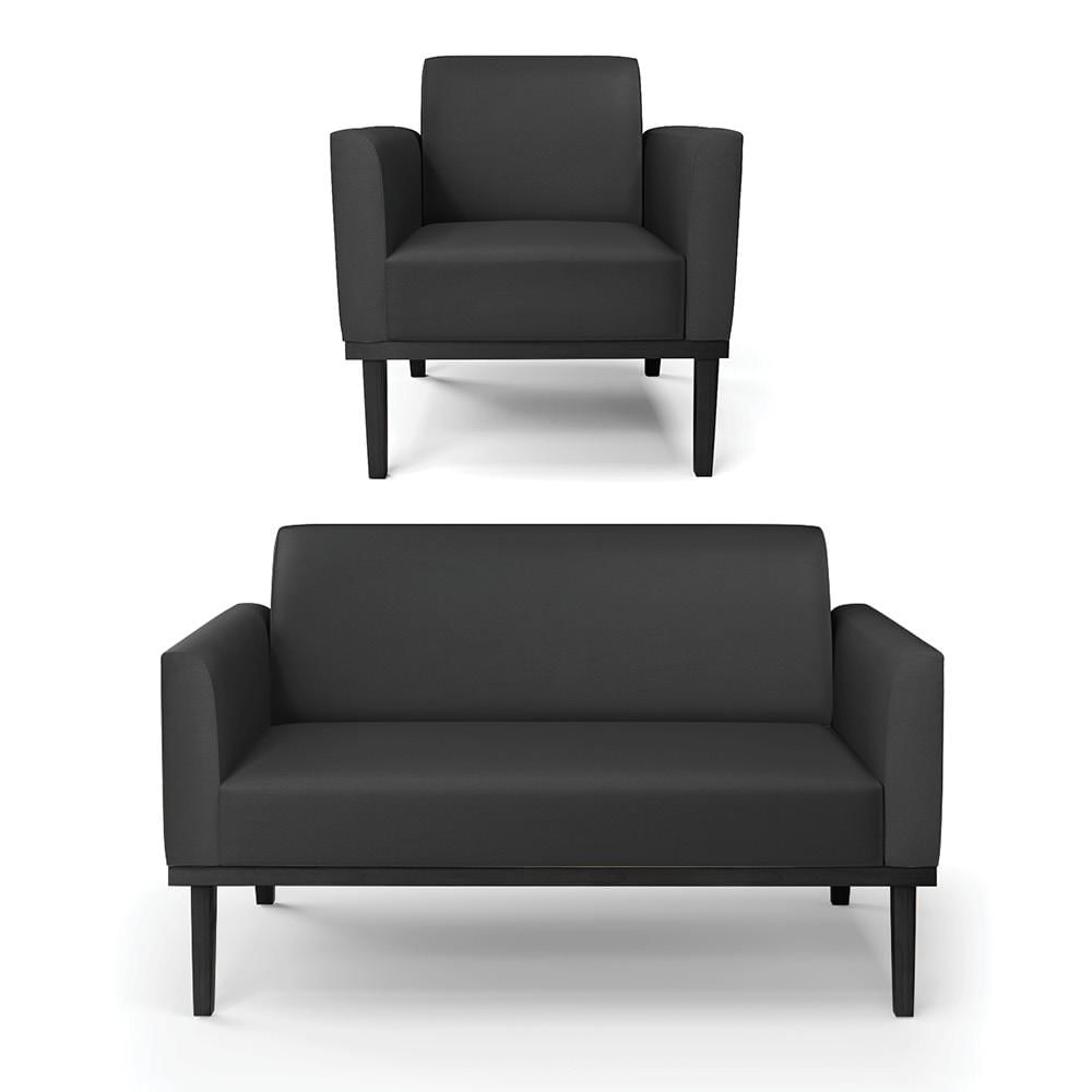 Conjunto Poltrona e Namoradeira Decorativa Isabella Pés Fixo em Madeira Preto PU Preto G19 - Gran Belo