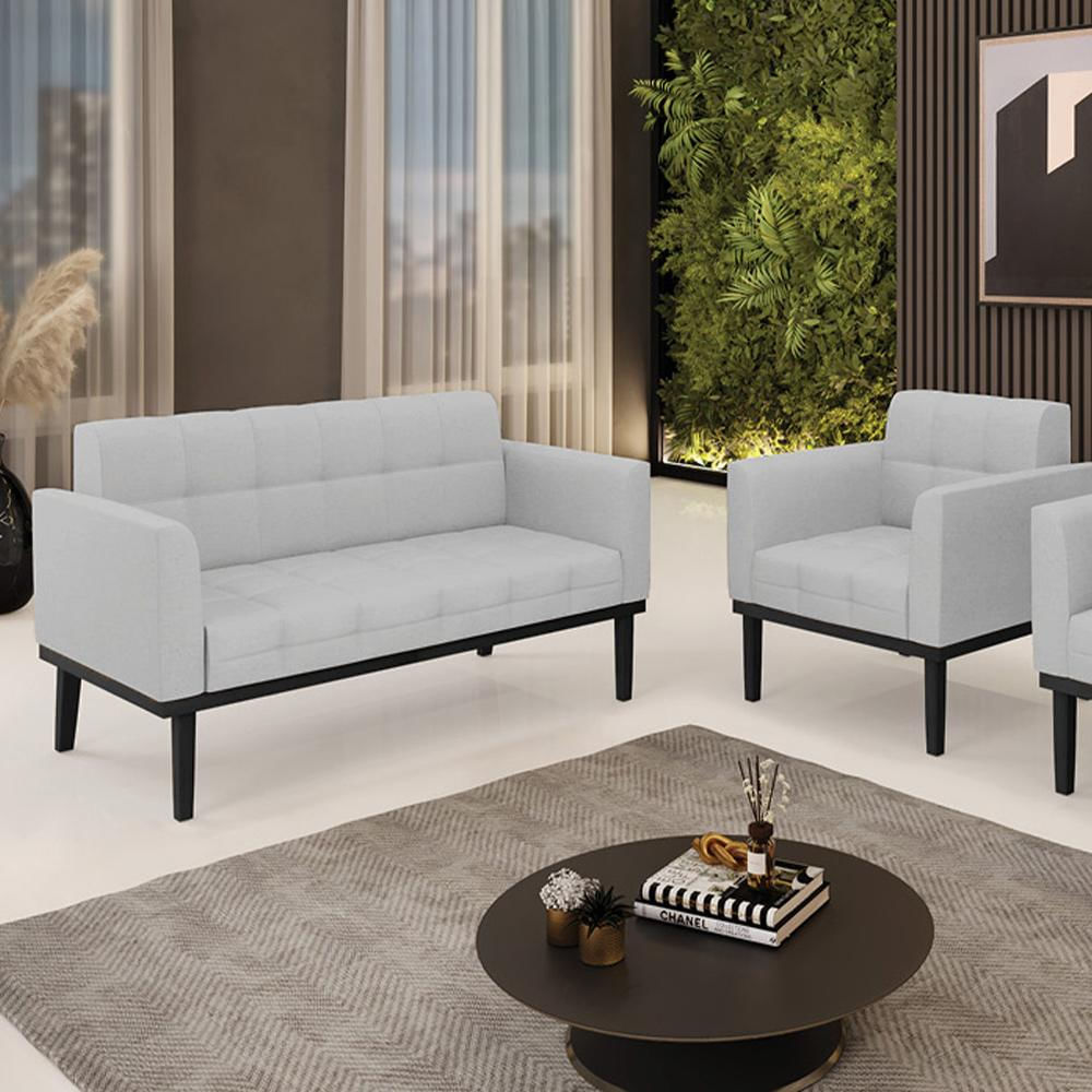 Conjunto Poltrona e Namoradeira Decorativa Karen Pés Fixo em Madeira Preto Linho Cinza G19 - Gran Belo