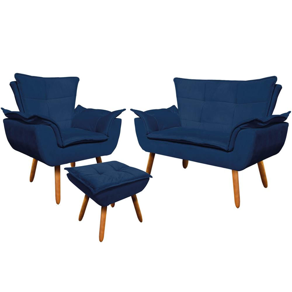Conjunto Poltrona Puff e Namoradeira Pés Palito Charger Suede Azul Marinho - Gran Belo