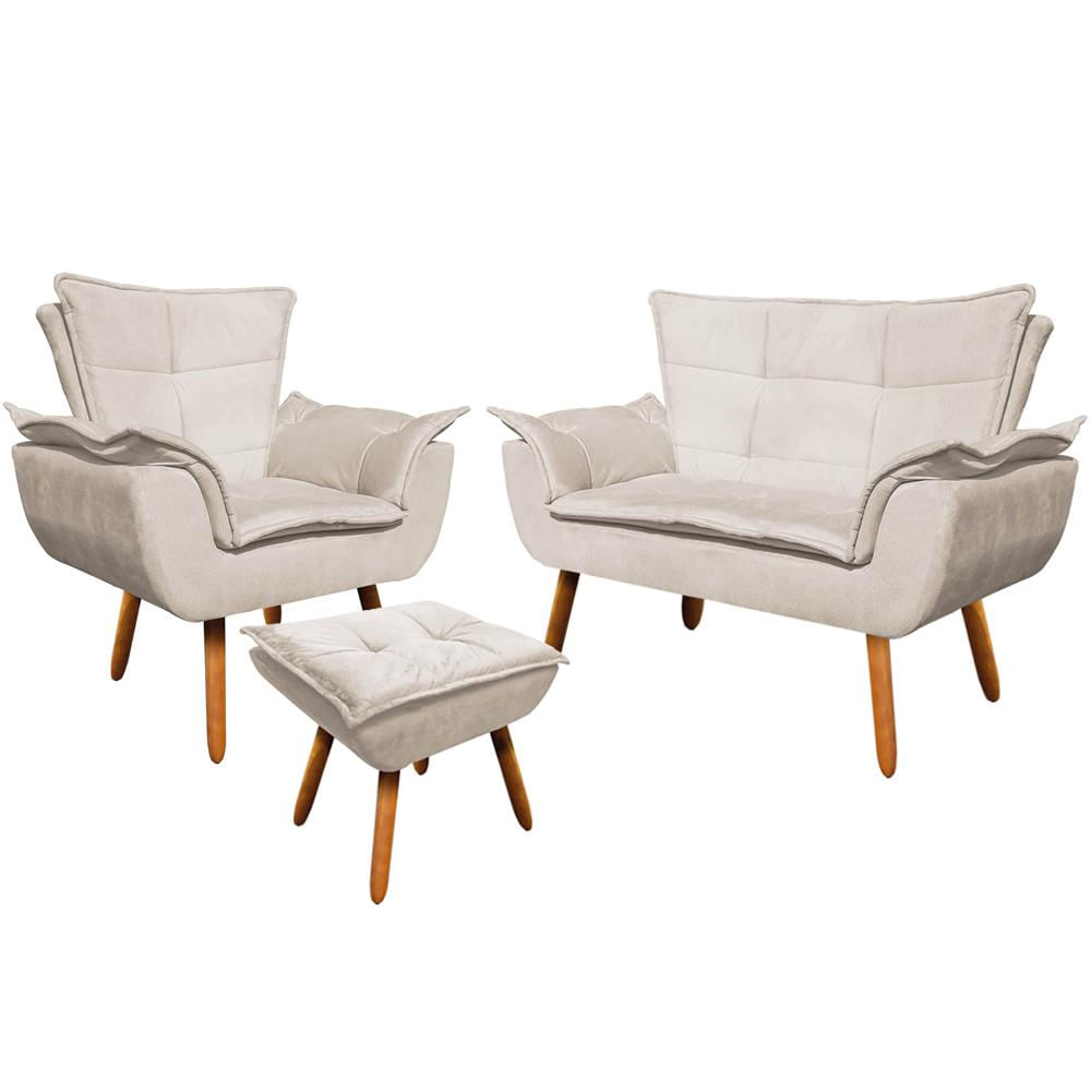 Conjunto Poltrona Puff e Namoradeira Pés Palito Charger Suede Bege - Gran Belo
