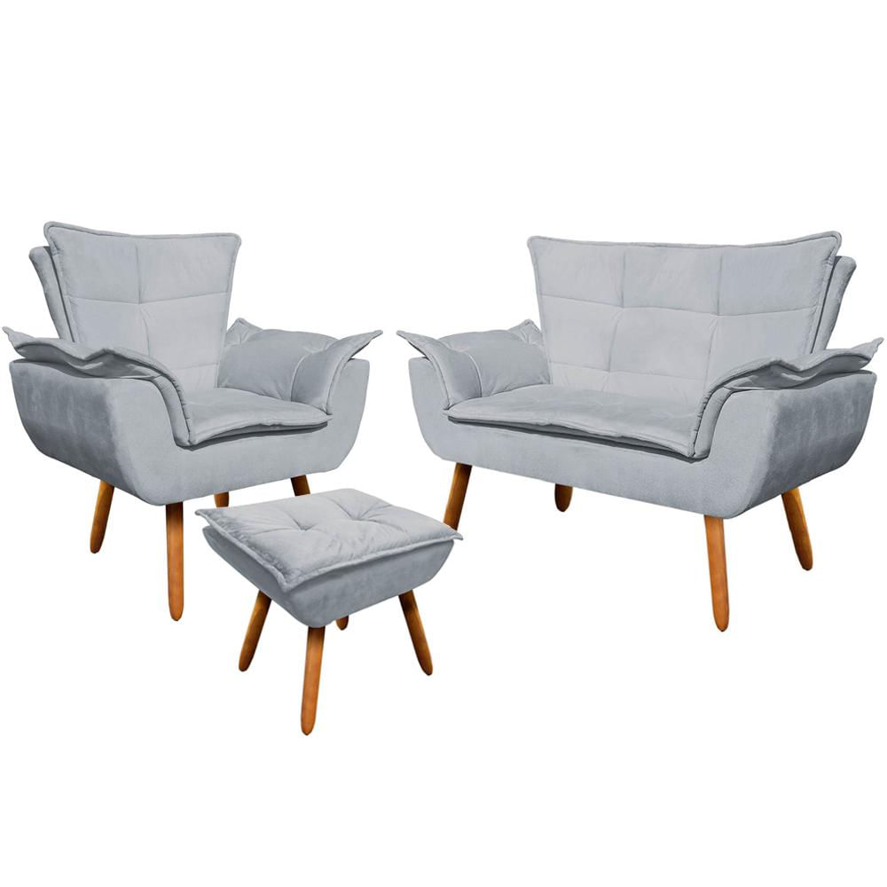 Conjunto Poltrona Puff e Namoradeira Pés Palito Charger Suede Cinza - Gran Belo