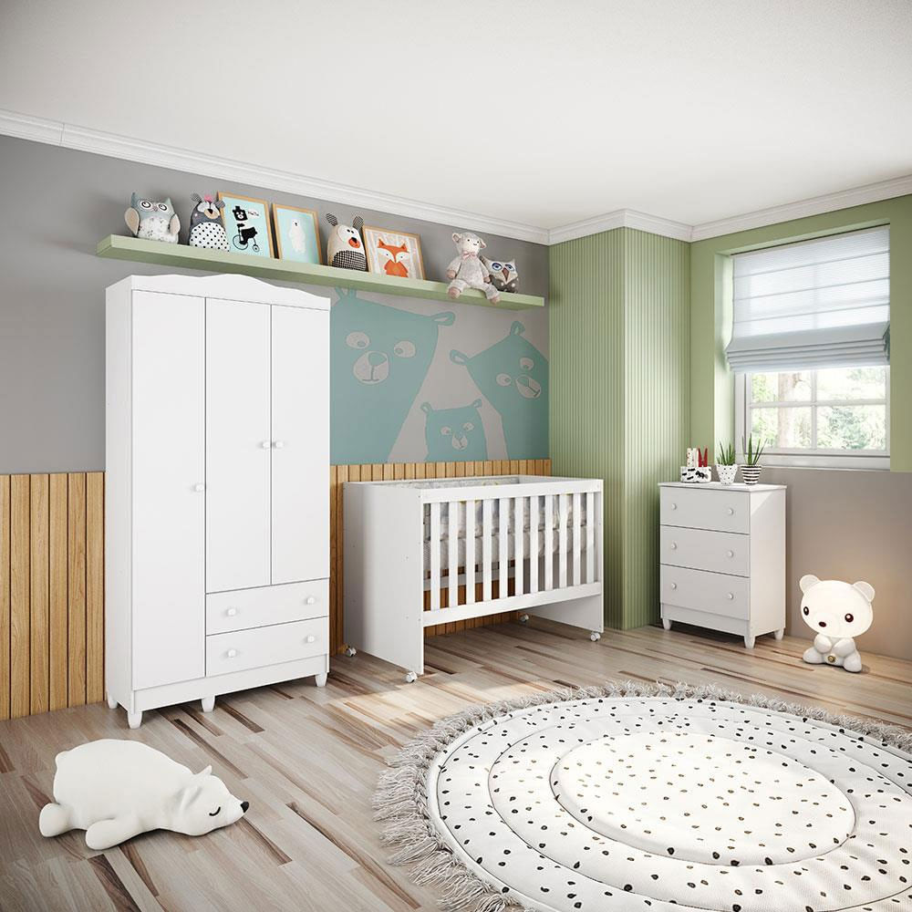 Esse encantador Conjunto Infantil Gabi da Peroba Móveis vai deixará o quarto do seu bebê uma graça! Ele dispõe de móveis feitos com material de alta qualidade e durabilidade. O guarda-roupa garante a qualidade que você tanto deseja, e por muito mais tempo. Resistente e altamente durável, ele é feito em MDP de alta resistência mecânica, conta com puxadores externos em material polimérico e acabamento em pintura por camadas de verniz foto-curado (UV), de composição não tóxica. São 3 portas de bater e 2 gavetas, com dobradiças e corrediças metálicas que possibilitam movimentos de abrir e fechar sobre trilhos metálicos, de forma prática. No interior, são 5 prateleiras bem distribuídas e amplos espaços para guardar roupas, agasalhos, chapéus, calçados, mochilas, bolsas, brinquedos, livros e demais objetos. Além disso, o móvel tem sistema de trava de segurança e tratamento anticupim e antimofo. Com tantas virtudes, esse produto é um item fundamental no ambiente das crianças! Já berço mini cama proporciona segurança e conforto para os pequenos dormirem tranquilamente. Ele tem cabeceira fabricada em MDP de alta resistência mecânica, estrado em chapa de MDF, de 6mm, com sistema de fixação por parafusos e porcas cilíndricas, e altura regulável. Estrutura robusta que fica completa com o acabamento caprichado por camadas de verniz fotocurado, de composição não tóxica, tornando o móvel ainda mais bonito e charmoso. Além de todos esses recursos, ele ainda dispõe de grade fixa de MDF e suporte para até 49kg. E claro que não poderíamos deixar de apresentar a linda cômoda. Resistente e altamente durável, ela é produzida também em MDP de alta resistência mecânica, conta com quatro pés e puxadores de plástico, e acabamento em pintura por camadas de verniz foto-curado (UV), de composição não tóxica. São 3 gavetas de correr, com corrediças metálicas que possibilitam movimentos de abrir e fechar sobre trilhos metálicos, de forma fácil e prática. No interior, amplos espaços para guardar desde roupas, pijamas e agasalhos até livros e objetos. Além disso, o móvel tem sistema de trava de segurança e tratamento anticupim e antimofo. Portanto, a cômoda Carolina Baby é indispensável no ambiente das crianças!