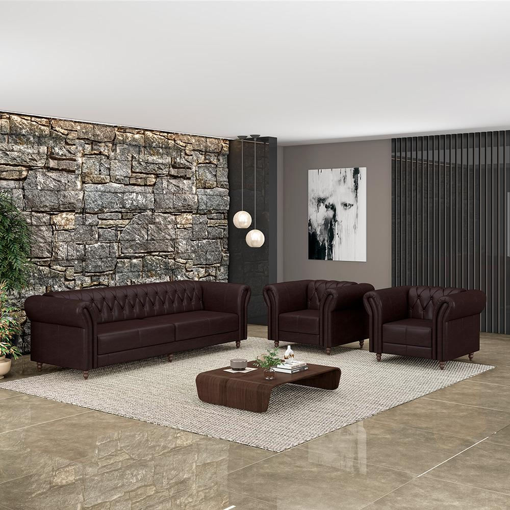 Transforme seu espaço com o Sofá e as Poltronas Stanford Chesterfield, um verdadeiro símbolo de sofisticação e conforto. Este conjunto exclusivo é composto por um sofá majestoso e duas poltronas elegantemente projetadas, todos com uma estrutura robusta de madeira reflorestada de eucalipto, garantindo durabilidade e um compromisso com a sustentabilidade ambiental. O encosto e os braços são preenchidos com fibra siliconada, oferecendo uma experiência de sentar-se macia e aconchegante, ao mesmo tempo que mantém a forma e o suporte ideais. O assento é um verdadeiro destaque, com cinta elástica italiana tensionada e uma almofada ensacada de espuma D-26, proporcionando um conforto firme e bem estruturado. Essa combinação promove um suporte excepcional e durabilidade, sendo perfeita para o uso diário. Os pés torneados fixos, confeccionados em madeira maciça, adicionam um toque de elegância clássica e estabilidade ao conjunto. O revestimento em couro não só confere um visual luxuoso e atemporal, mas também é fácil de manter e resiste ao desgaste, garantindo que seu sofá e poltronas mantenham sua beleza por muitos anos. O Sofá e as Poltronas Stanford Chesterfield são ideais para quem busca um equilíbrio entre estilo sofisticado e conforto inigualável. Seja para uma sala de estar, escritório ou espaço de recepção, este conjunto de móveis agrega um toque de classe e é a escolha perfeita para criar um ambiente acolhedor e refinado. Adquira agora o Sofá e as Poltronas Stanford Chesterfield e experimente o ápice do design de móveis com materiais de alta qualidade e um acabamento impecável. Ideal para quem aprecia a combinação perfeita de conforto e elegância!