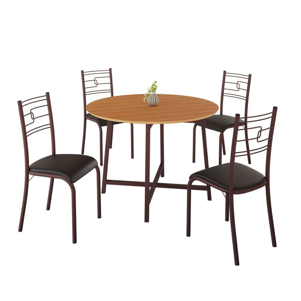 Conjunto de sala de jantar com mesa redonda de 90 cm e 4 cadeiras, ideal para ambientes modernos e elegantes. A mesa possui tampo em MDF padrão BP com acabamento semi fosco que remete à madeira, oferecendo um visual acolhedor e sofisticado. A base é fabricada em aço com design redondo , proporcionando estabilidade, resistência e um toque contemporâneo ao ambiente.As cadeiras possuem estrutura resistente, com encosto alto e conforto ergonômico, suportando até 120 kg cada. O conjunto é ideal para refeições em família, encontros com amigos ou para compor uma sala de jantar prática e bem decorada.Itens inclusos:1 mesa em MDF com base em aço4 cadeiras com estrutura reforçadaManual de montagem e kit de ferragensCaracterísticas do produto:Cor predominante: Marrom Variação : Preto LisoAcabamento: Semi foscoMaterial do tampo: MDFMaterial da base: AçoMaterial principal: AçoGarantia: 3 mesesComplexidade da montagem: Baixa – pode ser montado por uma pessoa sozinhaSistema de montagem: ParafusosLimpeza: Usar pano macio e seco; no tampo, pano levemente umedecido. Evitar o uso de detergentes, alvejantes e produtos químicos.Dimensões da mesa: Altura: 75 cm | Largura: 90 cm | Comprimento: 90 cmDimensões das cadeiras: Altura: 90 cm | Largura: 43 cm | Profundidade: 46 cm Capacidade de peso por cadeira: até 120 kgInformações Importantes:A montagem é responsabilidade do cliente. Recomendamos a contratação de um profissional.Produto acompanha manual e kit de montagem.As cores podem variar conforme a tela do dispositivo.Objetos decorativos não estão inclusos.Verifique volumes e embalagens no ato da entrega.A entrega não inclui subir escadas ou içamento.Confira as dimensões do produto antes da compra.