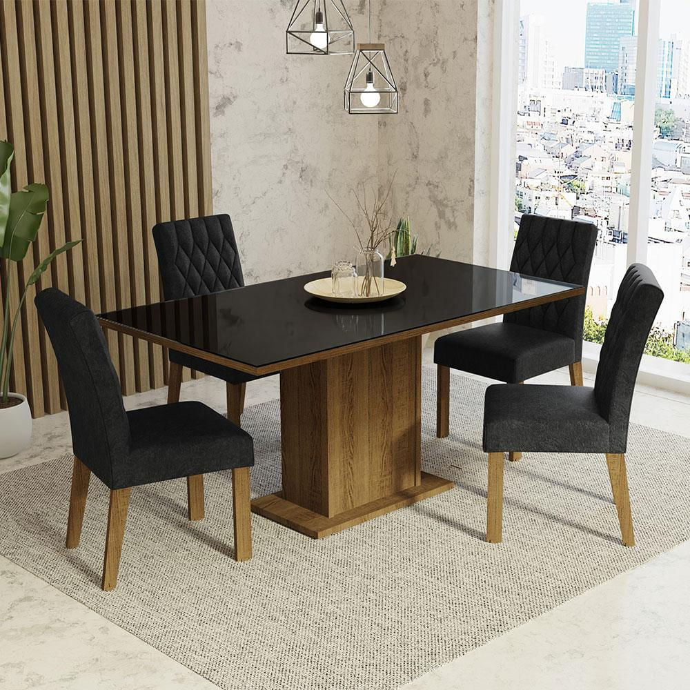 Conjunto Sala de Jantar Mesa Tampo de Vidro 4 Cadeiras Rustic/Preto/Oxford Marilia Madesa Rustic/Preto/Oxford
