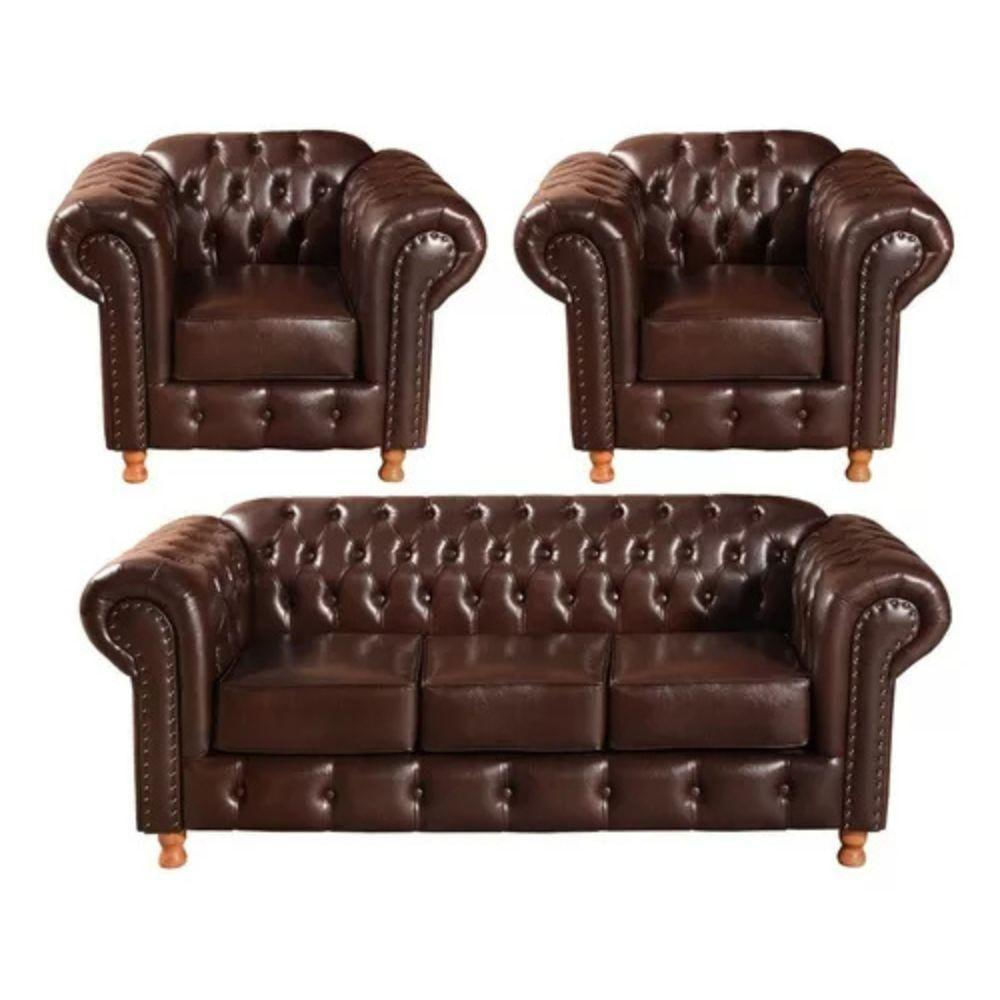 Conjunto Sofá 3 Lugares E 2 Poltrona Chesterfield Luís Xv Vintage Retrô Capitonê Couro Marrom
