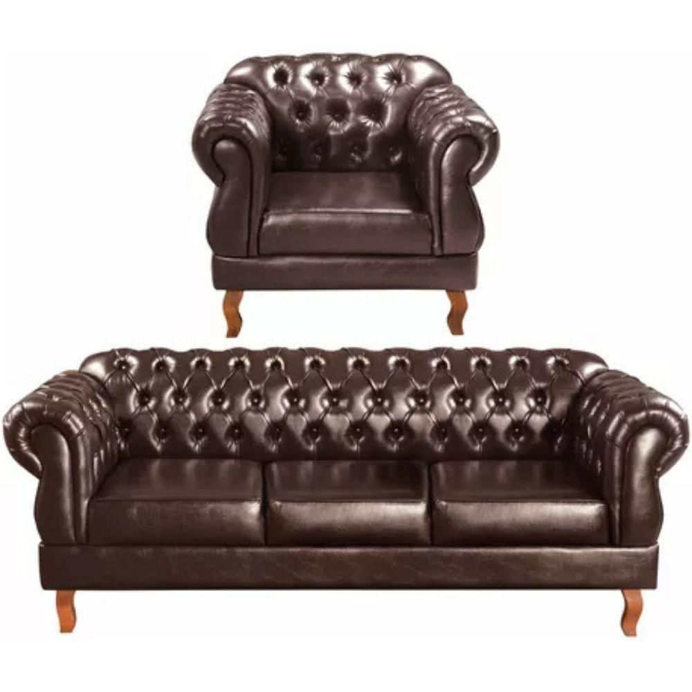 Conjunto Sofá 3 Lugares E Poltrona Chesterfield Luís Xv Vintage Retrô Capitonê Couro Marrom