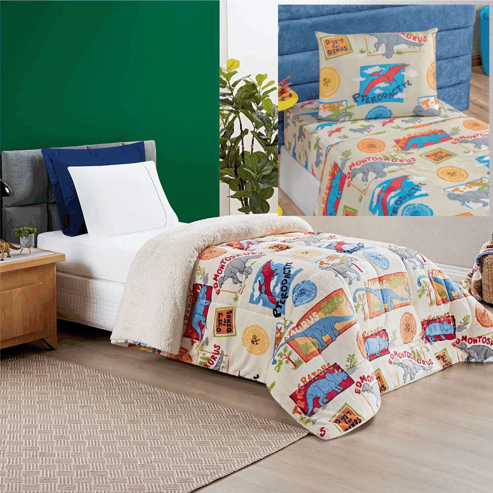 - Coordenado Edredom e Lençol Diverkids Solteiro 4 Peças - Dinossauro