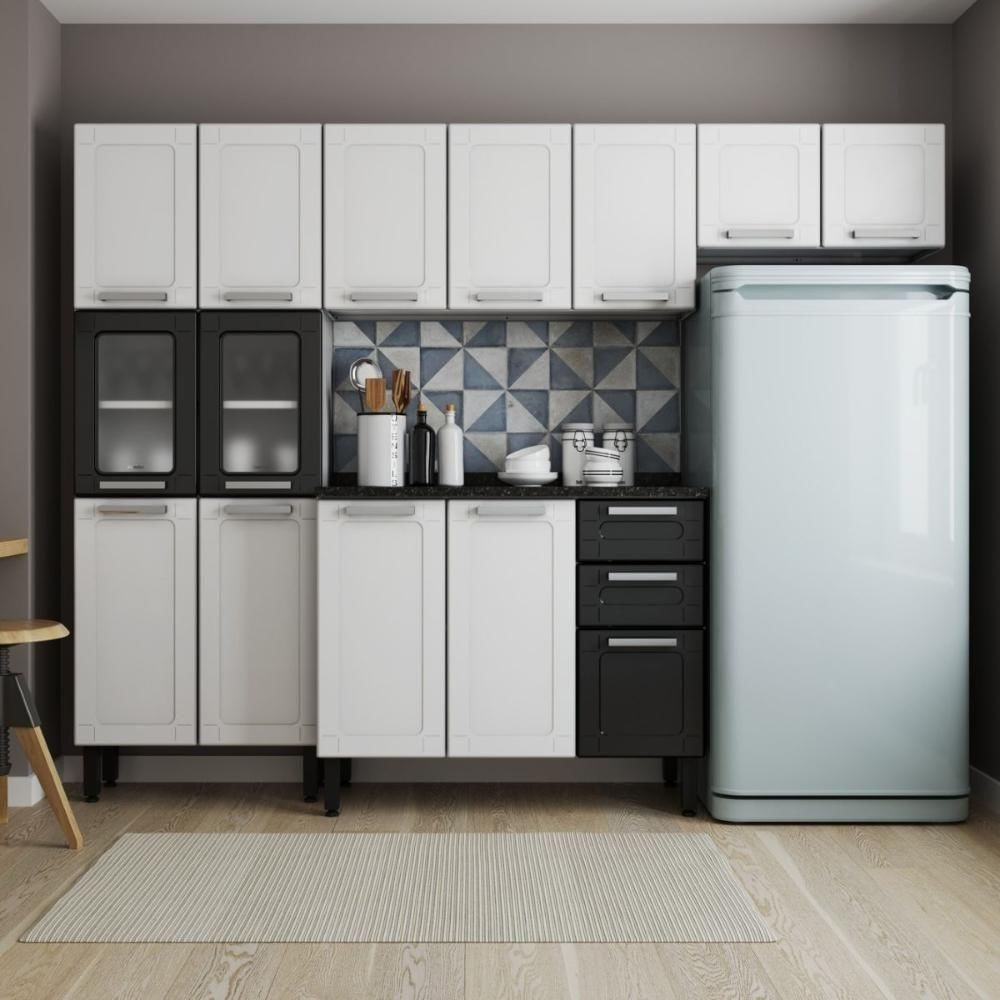 A Linha Múltipla permite que a criatividade transforme os espaços. Modular e versátil, ela é pensada para todos os tamanhos e tipos de cozinha. A estrutura dos móveis é 100% aço, material resistente e durável, com pintura de cobertura eficiente, a mesma utilizada em automóveis, que garante durabilidade, resistência, e uma superfície lisa que não absorve gordura e é fácil de limpar. Os módulos da Múltipla são nas cores Branco e Preto, perfeitos para combinar com toda casa! Os puxadores com acabamento metalizado e proteção UV conferem maior durabilidade às peças. As portas possuem uma estrutura reforçada com um acabamento arredondado nas bordas garantindo maior segurança.CARACTERÍSTICAS:- Marca: Bertolini Móveis- Linha: Múltipla- Condição do Item: Novo- Material: Aço/MDP- Tipo de Móveis de Cozinha: Cozinha completa- Acabamento: Pintura eletrostática- Puxadores: Ergonômicos com proteção UV- Quantidade de Portas: 14- Quantidade de Gavetas: 2- Tipo da Dobradiça da Porta: Metálica- Quantidade de Volumes: 4- Dimensões da Embalagem: 38 x 74 x 111,5 cm- Peso da Embalagem: 68,85 kgDIMENSÕES DO PRODUTO MONTADO:- Altura: 191 cm- Largura: 245 cm- Profundidade: 43,2 cm- Peso: 65,13 kg