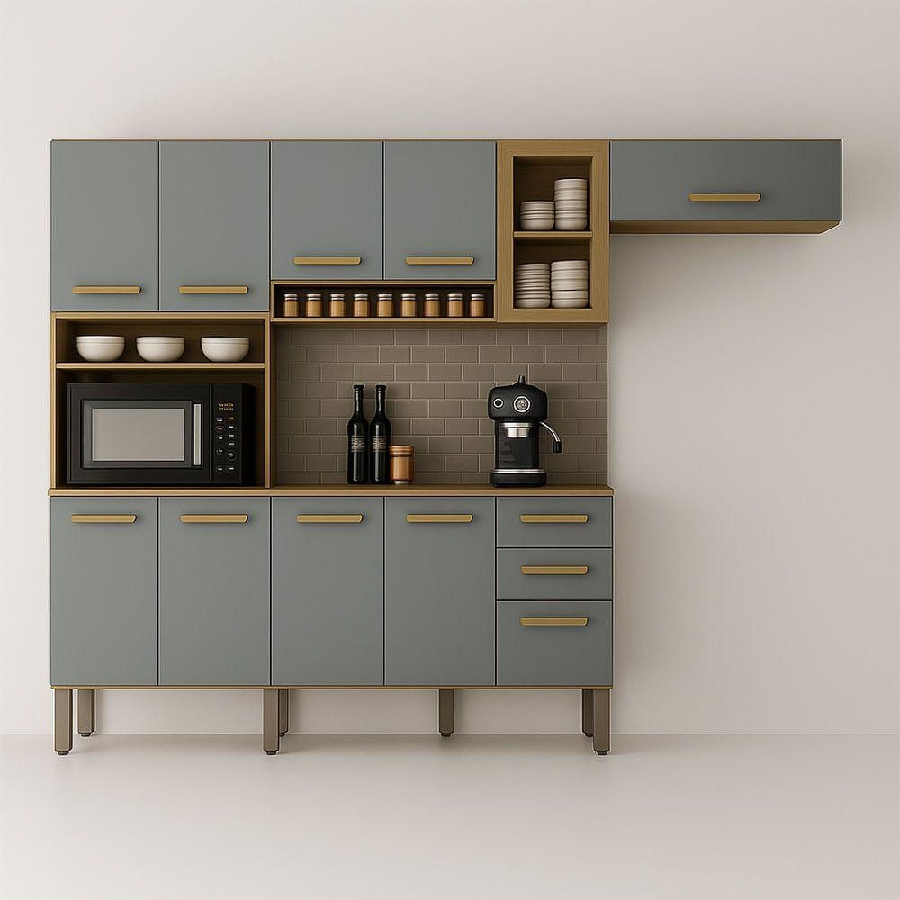 Destaques da Cozinha Athenas !! Design moderno: combina tons amadeirados e portas clean. Amplo espaco interno: ideal para loucas, panelas, condimentos e eletros. Resistencia e durabilidade: estrutura em MDP/MDF com pintura UV. Funcionalidade garantida: nichos para micro-ondas, cafeteira e utensilios. Praticidade no dia a dia: puxadores modernos e dobradicas metalicas resistentes.