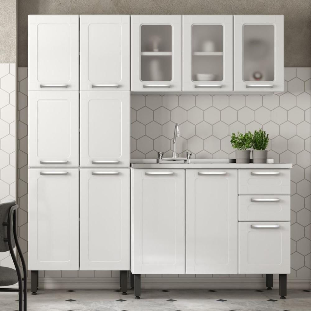 A Linha Múltipla permite que a criatividade transforme os espaços. Modular e versátil, ela é pensada para todos os tamanhos e tipos de cozinha. A estrutura dos móveis é 100% aço, material resistente e durável, com pintura de cobertura eficiente, a mesma utilizada em automóveis, que garante durabilidade, resistência, e uma superfície lisa que não absorve gordura e é fácil de limpar. Os módulos da Múltipla são nas cores Branco e Preto, perfeitos para combinar com toda casa! Os puxadores com acabamento metalizado e proteção UV conferem maior durabilidade às peças. As portas possuem uma estrutura reforçada com um acabamento arredondado nas bordas garantindo maior segurança.CARACTERÍSTICAS:- Marca: Bertolini Móveis- Linha: Múltipla- Condição do Item: Novo- Material: Aço- Tipo de Móveis de Cozinha: Cozinha completa- Acabamento: Pintura eletrostática- Puxadores: Ergonômicos com proteção UV- Quantidade de Portas: 12- Quantidade de Gavetas: 2- Tipo da Dobradiça da Porta: Metálica- Quantidade de Volumes: 4- Dimensões da Embalagem: 45,5 x 74 x 111,5 cm- Peso da Embalagem: 61,99 kgDIMENSÕES DO PRODUTO MONTADO:- Altura: 191 cm- Largura: 175 cm- Profundidade: 43,2 cm- Peso: 58,03 kg