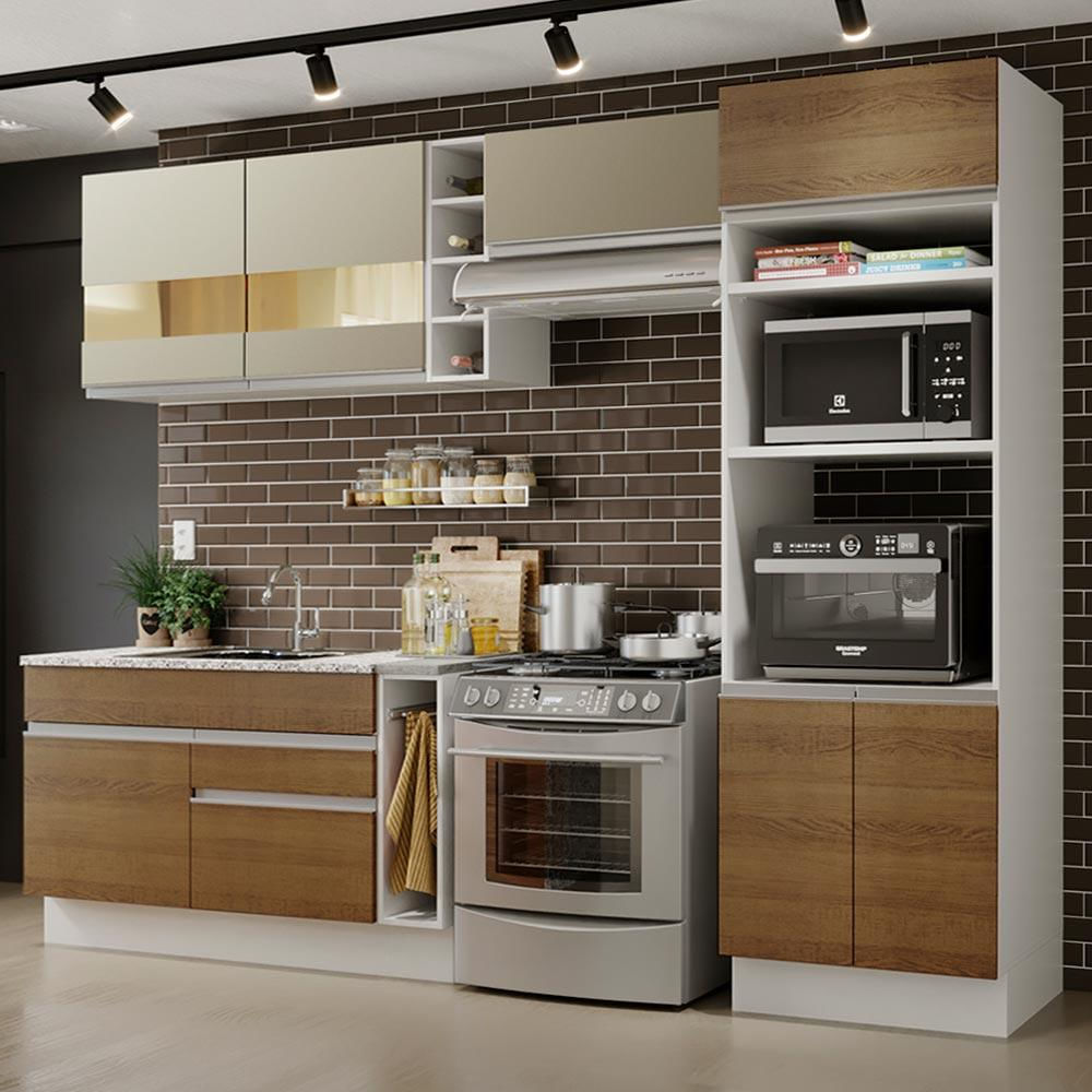 Cozinha Completa Madesa Cristal com Armário e Balcão (Sem Tampo e Pia) - Branco/Rustic/Crema Branco/Rustic/Crema
