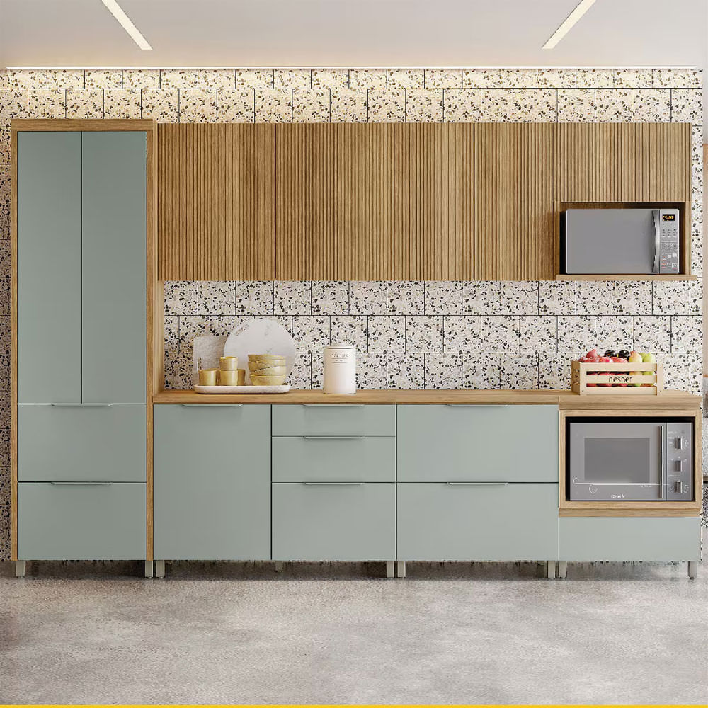 Cozinha Completa Nesher Paris 7 Peças 340 cm Balcão Forno Nicho Micro-ondas verde e nature entrega elegância, praticidade e durabilidade! Produzida em MDF de 15 mm, combina resistência estrutural com acabamento sofisticado em pintura UV fosca, que valoriza ainda mais o ambiente. O conjunto conta com: