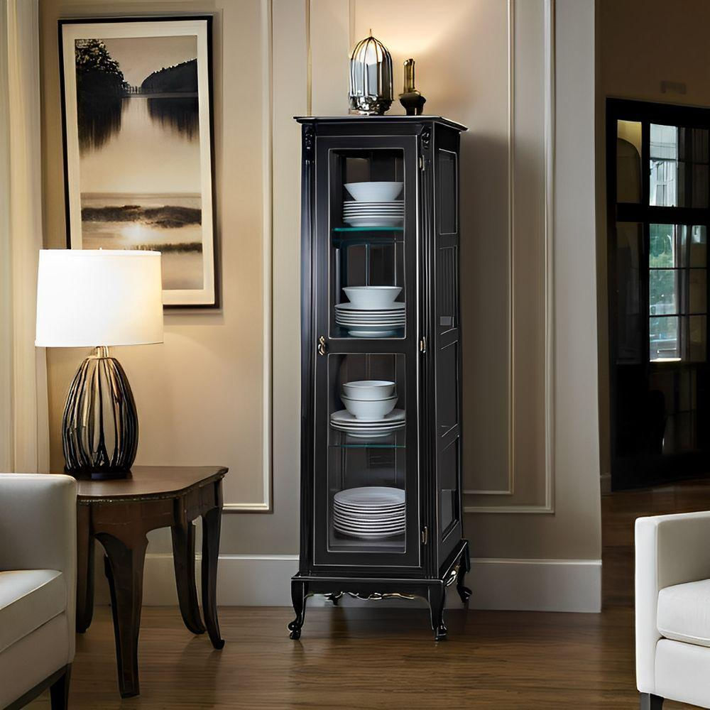 Cristaleira De Madeira 1 Porta 3 Prateleiras, Espelho E Pés Luiz Xv - Preto Laca