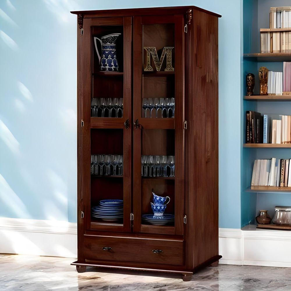 Cristaleira Rústica De Madeira Com 2 Portas, 3 Prateleiras, 1 Gaveta E Pés Torneados - Pinhão