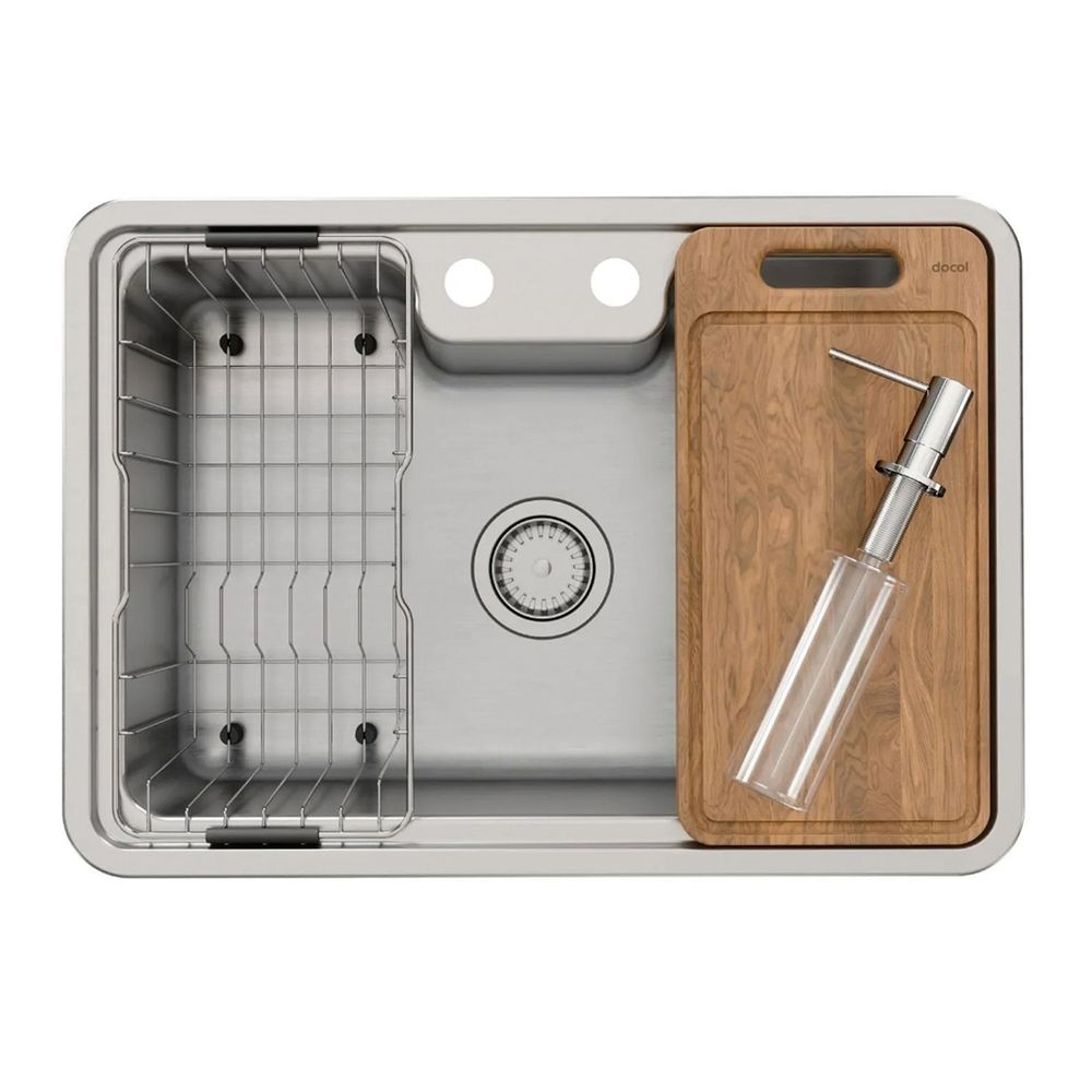 Cuba de Sobrepor/Embutir Massima Aço Inox Escovado Com Acessórios 64x44 - Docol 90015693016 Prática e versátil, a cuba DocolMassima é garantia de funcionalidade e eficiência na cozinha. Fabricada em aço inoxidável 304 (alto teor de cromo e níquel, maior durabilidade) com acabamento escovado, seu desenho inteligente além de oferecer excelente área útil, permite a instalação embutida ou sobreposta e a disposição confortável de um misturador monocomando e de um dispensador de detergente. Seus acessórios exclusivos: cesto escorredor aramado e tábua de corte em madeira teca que se encaixam perfeitamente em ambos os lados da cuba, facilitando as tarefas do dia a dia; dispensador de detergente, prático e resistente, despeja a quantidade ideal do produto e resiste a 150 mil ciclos de funcionamento Para garantir maior praticidade também na instalação, a DocolMassima vem com todos os complementos necessários: válvula, sifão, tampões de vedação, gabaritos, calços e grampos de fixação, que garantem a montagem perfeita na bancada, tanto para instalação de embutir como de sobrepor. Características do Produto: Material: Aço inoxidável 304, Elastômeros, Polímero de engenharia, Madeira Teca, Latão. Acabamento: Escovado Tipo de instalação: Embutir/Sobrepor. Aconpanha: 1 Dispensador de detergente, 1 Tábua de corte, 1 Cesto aramado, 1 Válvula 4 1/2”, 1 Tampão e Sifão extensível 72 cm. Dimensões Externas(LxAxP): 48x20x68 cm. Dimensões Internas (LxAxP): 44x20x64 cm. Peso: 6,9 Kg