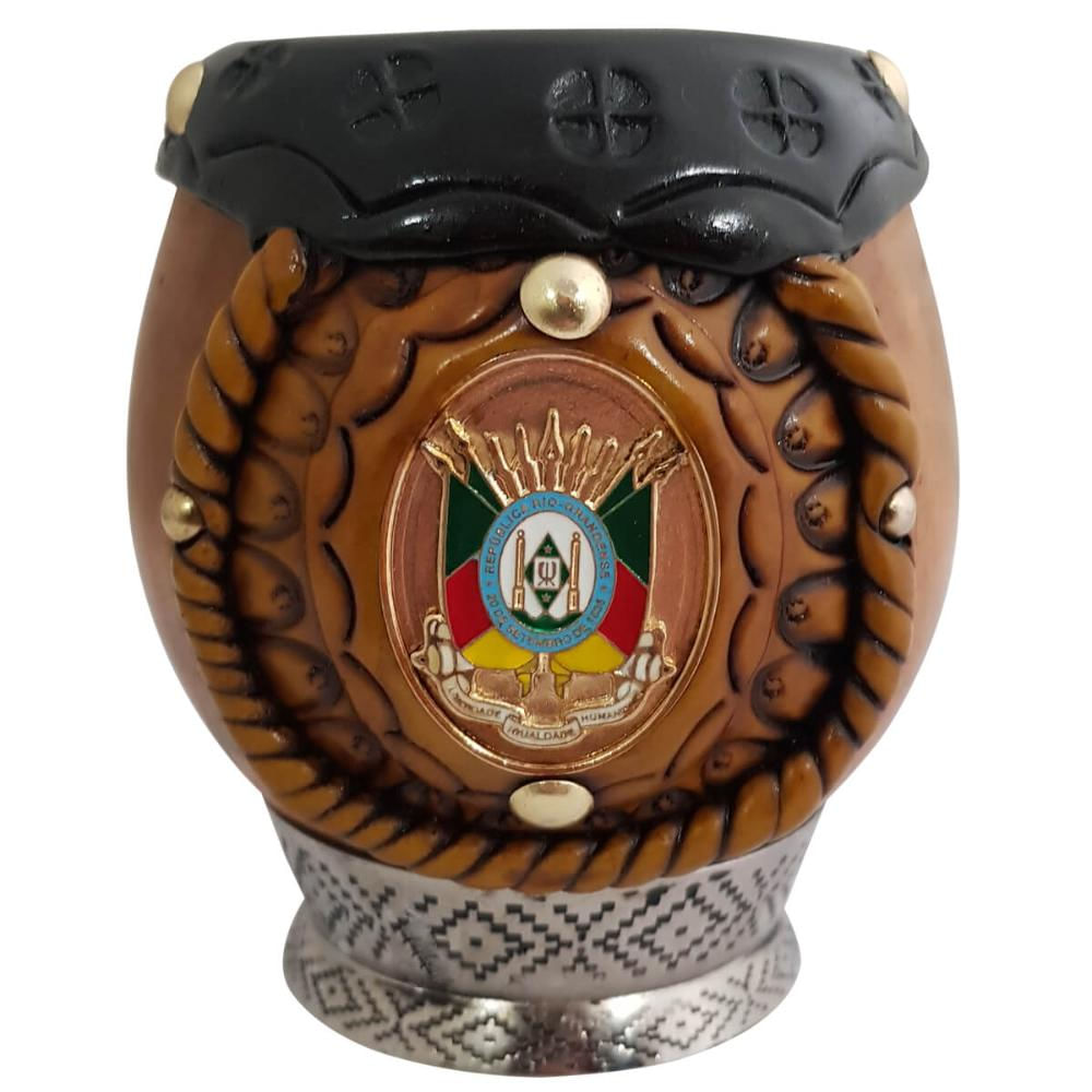 Garantia: 90 dias / Peso: 260g / Cor: Marrom, Dourado e Preto / Ref: 84083 Dimensões Aproximadas da Cuia: 8,5cm (C) x 9cm (L) x 10,5cm (A); - Abertura do bocal: Aproximadamente 5cm (C). Cuidados: A cuia já está curtida, ou seja, pronta para o uso, basta lavar com esponja macia e sabão neutro e fazer o chimarrão. A água a ser usada não deve ultrapassar os 75º, não utilizar água fervendo. Capacidade: Aproximadamente 200ml. *A cuia é produzida com materiais naturais, por isso podem ocorrer pequenas variações de traços, tonalidades e tamanho. *Não acompanha bomba.