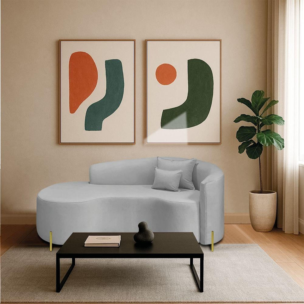 Divã Recamier Curvo Sala De Estar Recepção Inglaterra 180cm Pés Metal Dourado Lado Esquerdo Linho Cinza Claro