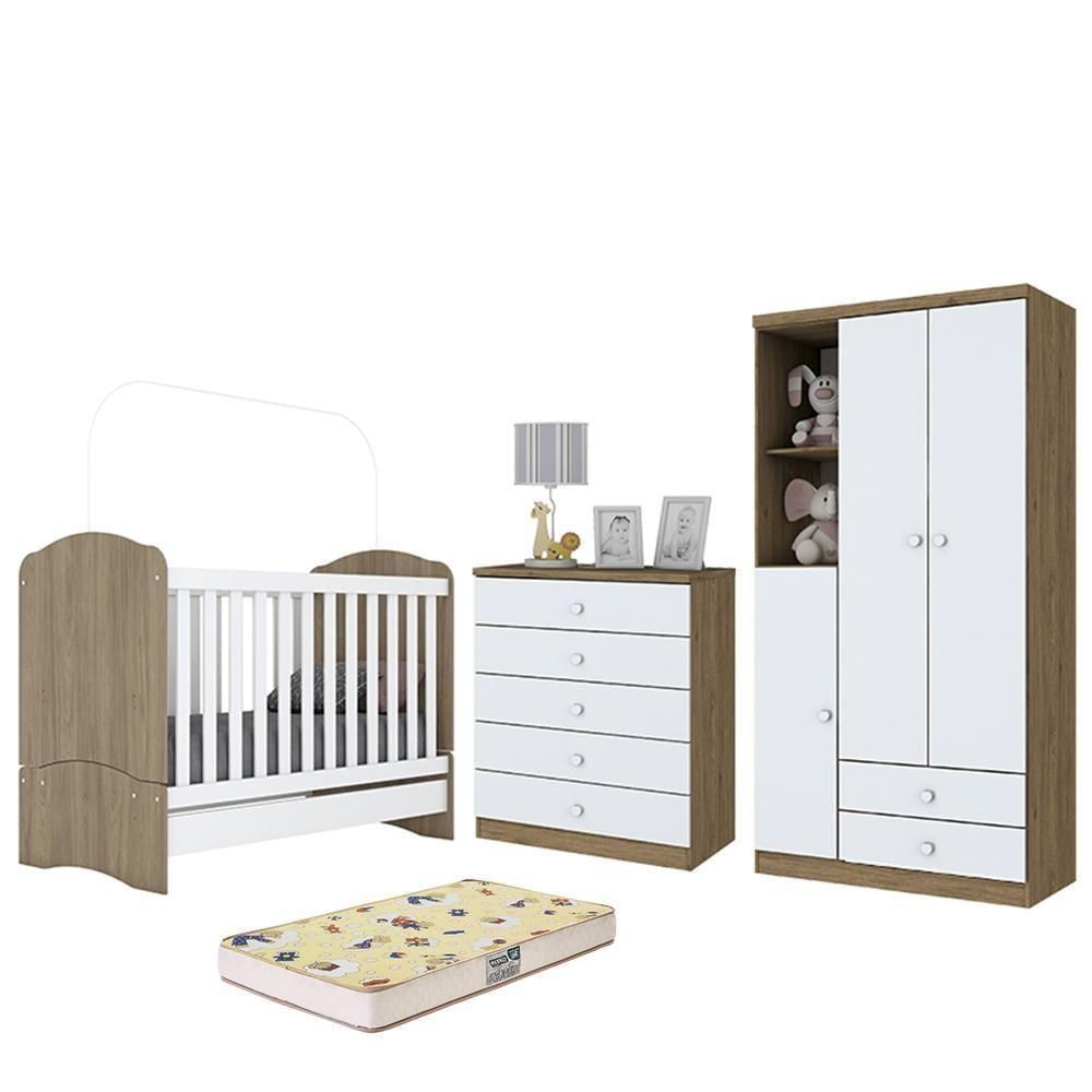 Dimensões: Tamanho do Guarda-Roupa (L x A x P): 91 x 180,5 x 40 cm Tamanho da Cômoda (L x A x P): 75 x 93 x 40 cm Tamanho do Berço (L x A x P): 132,7 x 101,5 x 68 cm Tamanho do Colchão (L x A x P): 130 x 10 x 60 cm