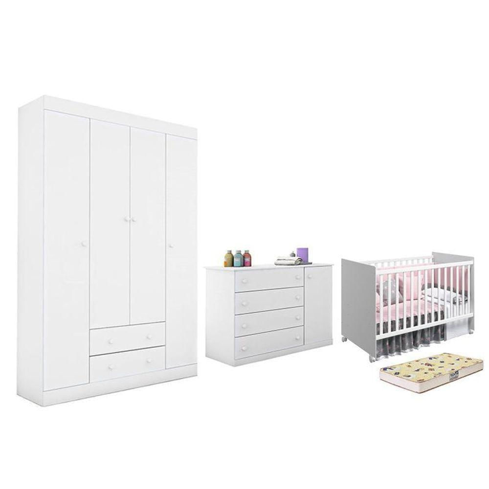 Dimensões: Tamanho do Guarda-Roupa (L x A x P): 147 x 203 x 45 cm Tamanho da Cômoda (L x A x P): 105 x 92 x 45 cm Tamanho do Berço (L x A x P): 133 x 91 x 66 cm Tamanho do Colchão (L x A x P): 60 x 10 x 130 cm