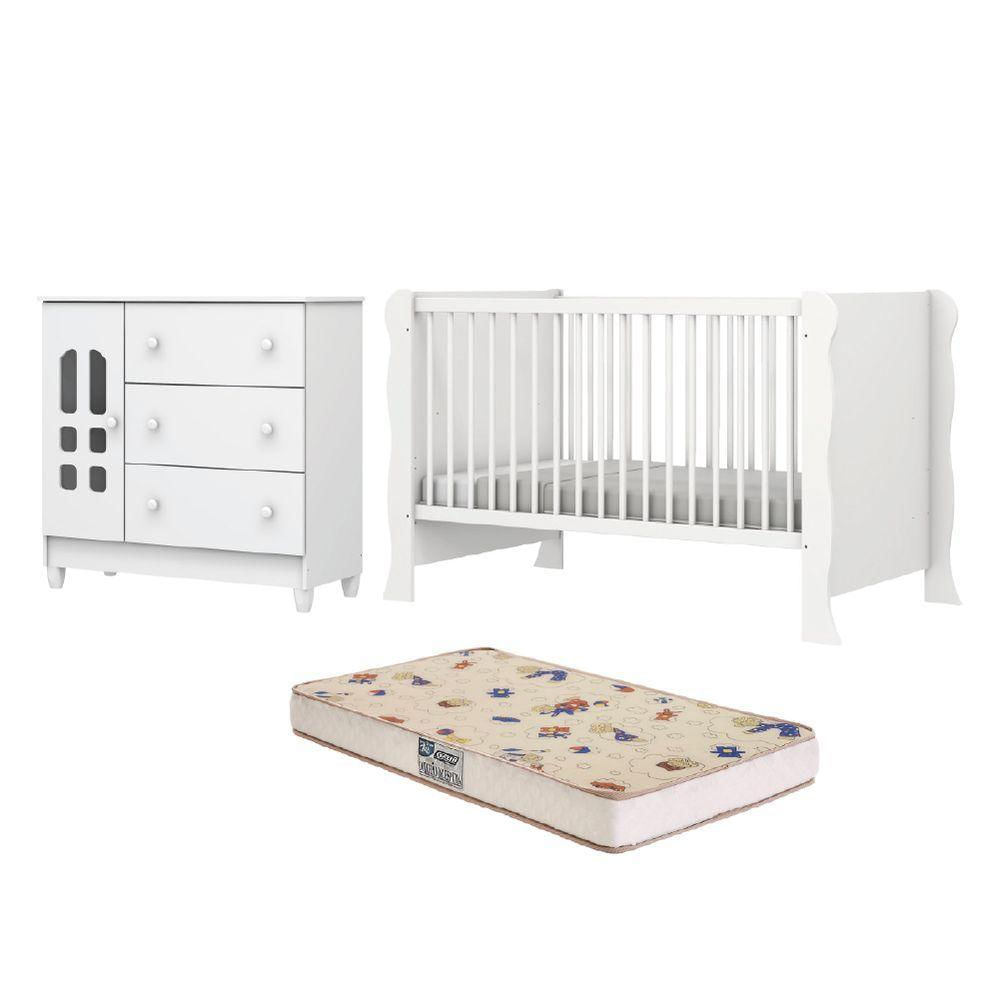 Dormitório Infantil Berço Com Colchão Mini Cama 2 Em 1 E Cômoda Para Quarto Bebê Branco