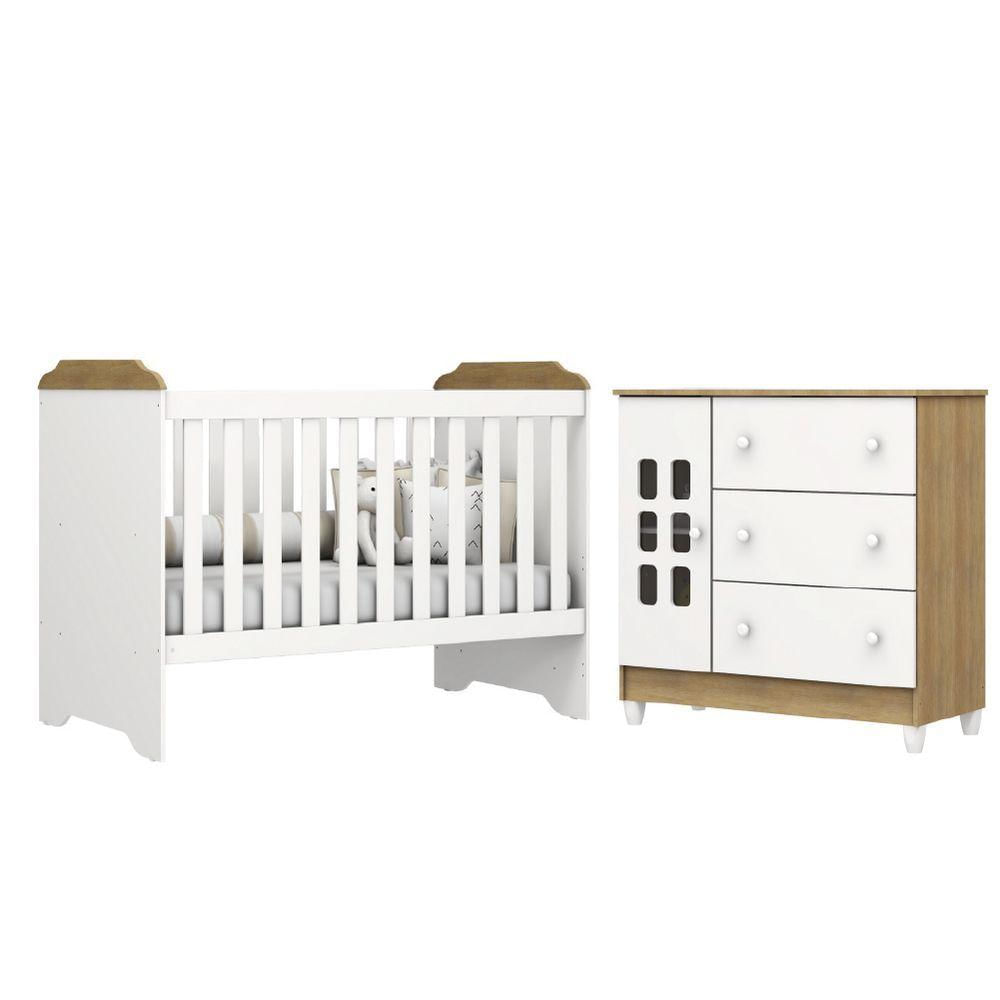 Dormitório Infantil Carolina Baby Berço Americano Mini Cama 3 Em 1 E Cômoda Luna Branco-madeirado