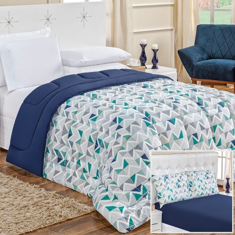 Edredom 2,40 x 2,20m + Jogo de Cama Malha Quality Queen 04 Peças 100% Algodão - Geométrico Azul