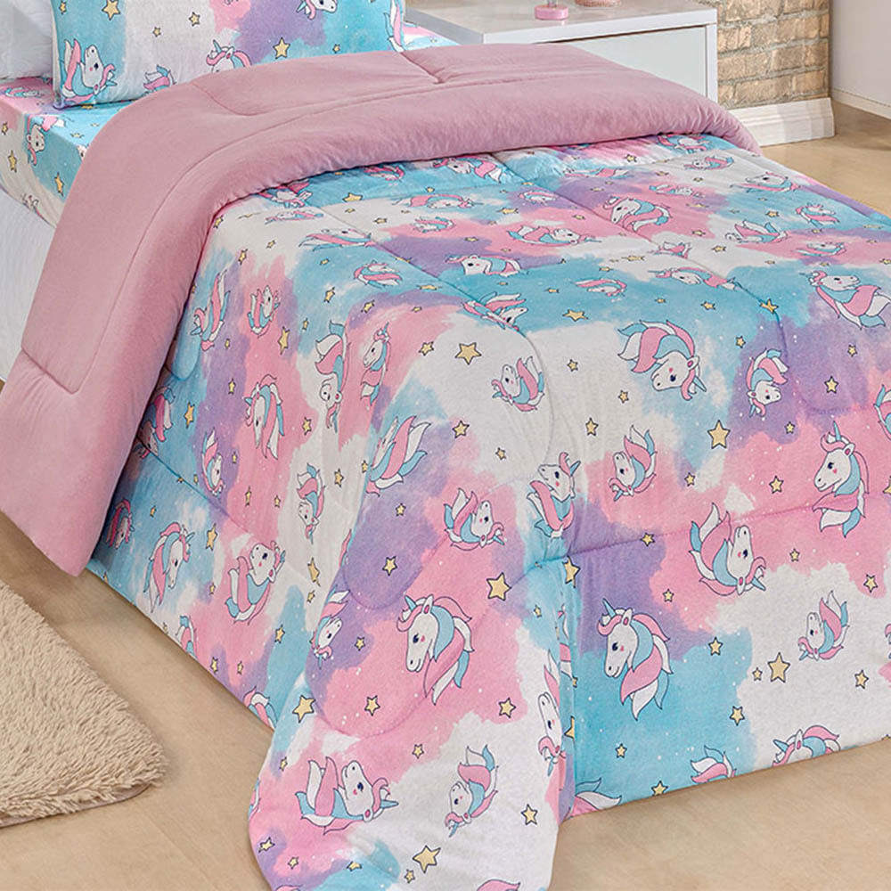 Edredom Fantasy Unicórnio Solteiro Infantil Tecido Malha 100% Algodão Macio Antialérgico - Rosa