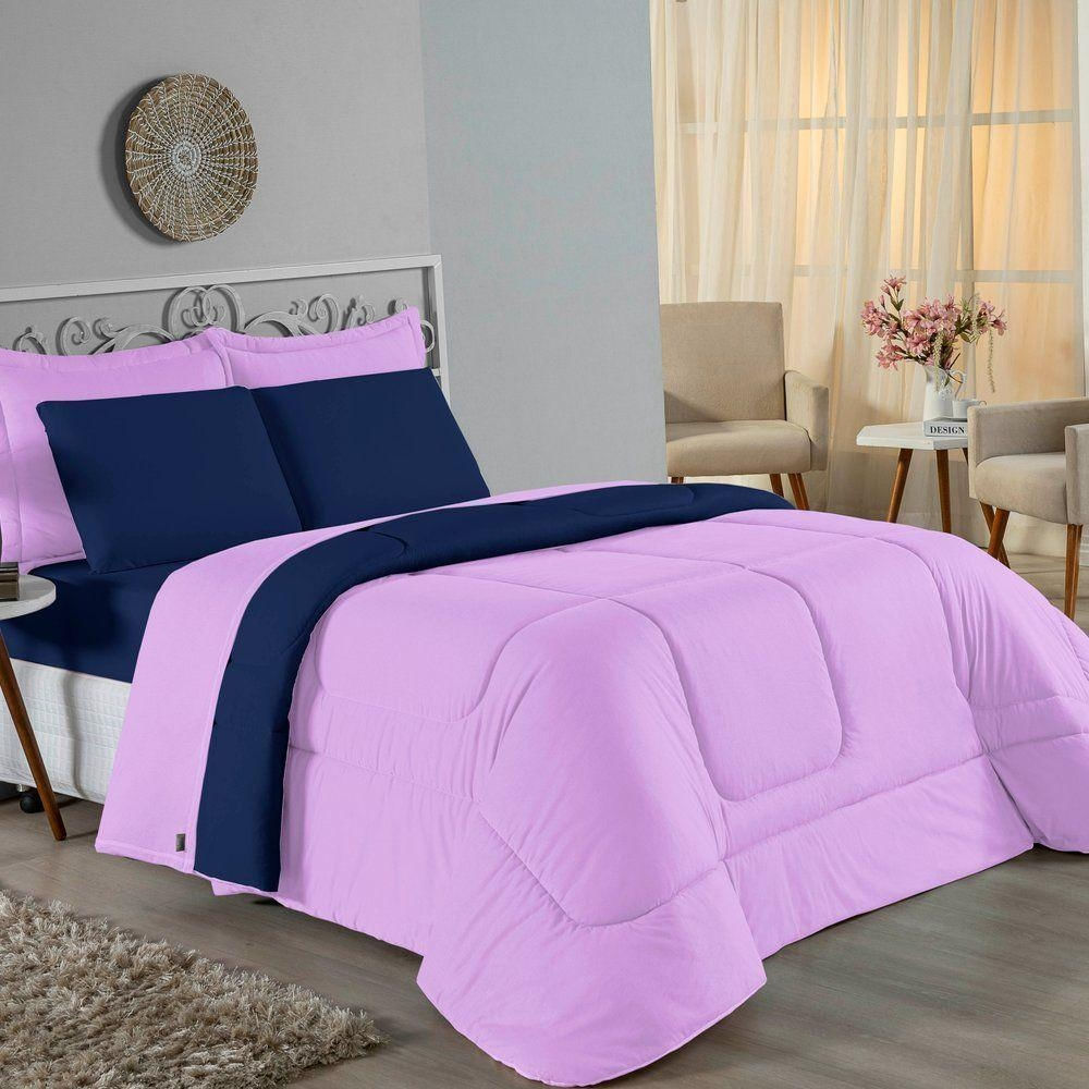 Edredom Queen Nobre 1 Peça Dupla Face 2,20m X 2,40m Malha 100% Algodão - Lilás / Azul-marinho