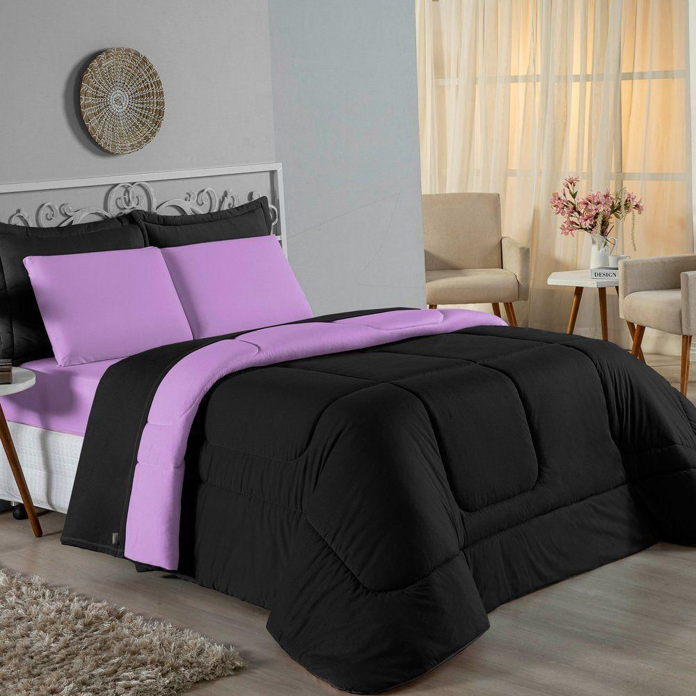 Edredom Queen Nobre 1 Peça Dupla Face 2,20m X 2,40m Malha 100% Algodão - Preto / Lilás