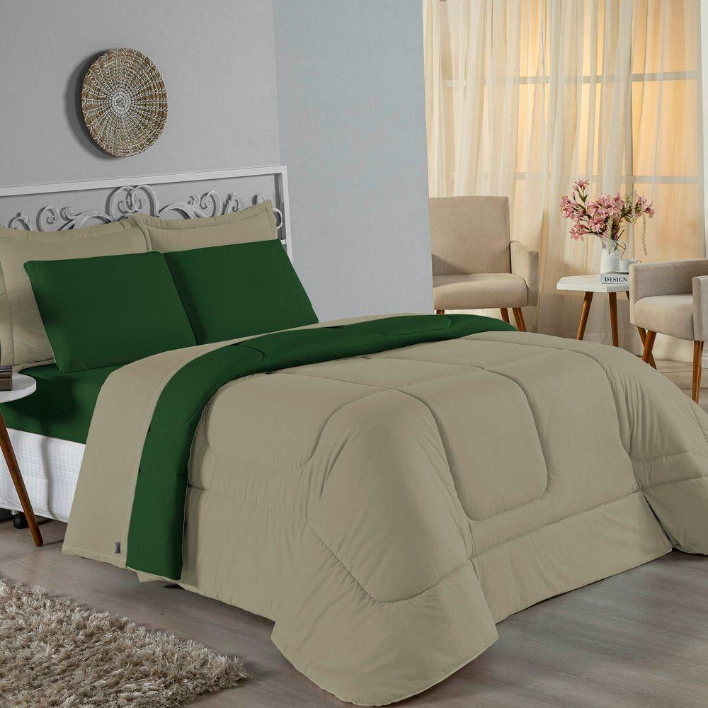 Edredom Queen Nobre 1 Peça Dupla Face 2,40m X 2,60m Malha 100% Algodão - Avelã / Verde-bandeira