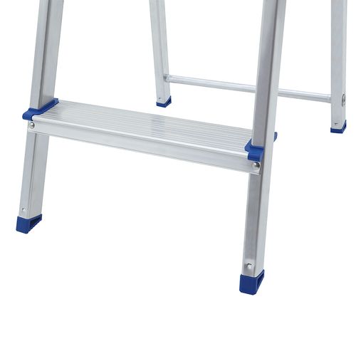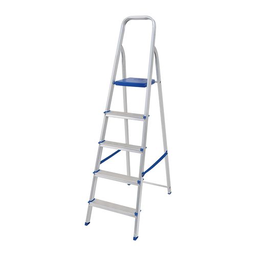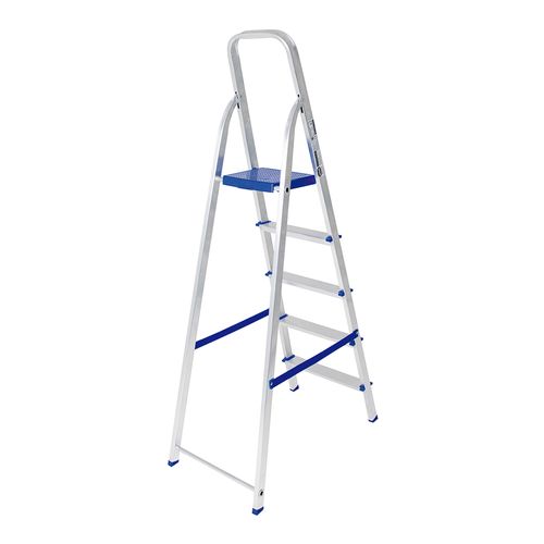 Com 5 degraus, essa escada é indicada para tarefas que exigem um pouco mais de altura, como trocar lâmpadas ou pintar paredes. A altura total da escada aberta é de aproximadamente 1,56 metros, o que permite ao usuário alcançar lugares elevados com facilidade e segurança, e fechada tem 1,69 metros. Suporta até 120kg e conta com sistema de sustentação traseira em X.