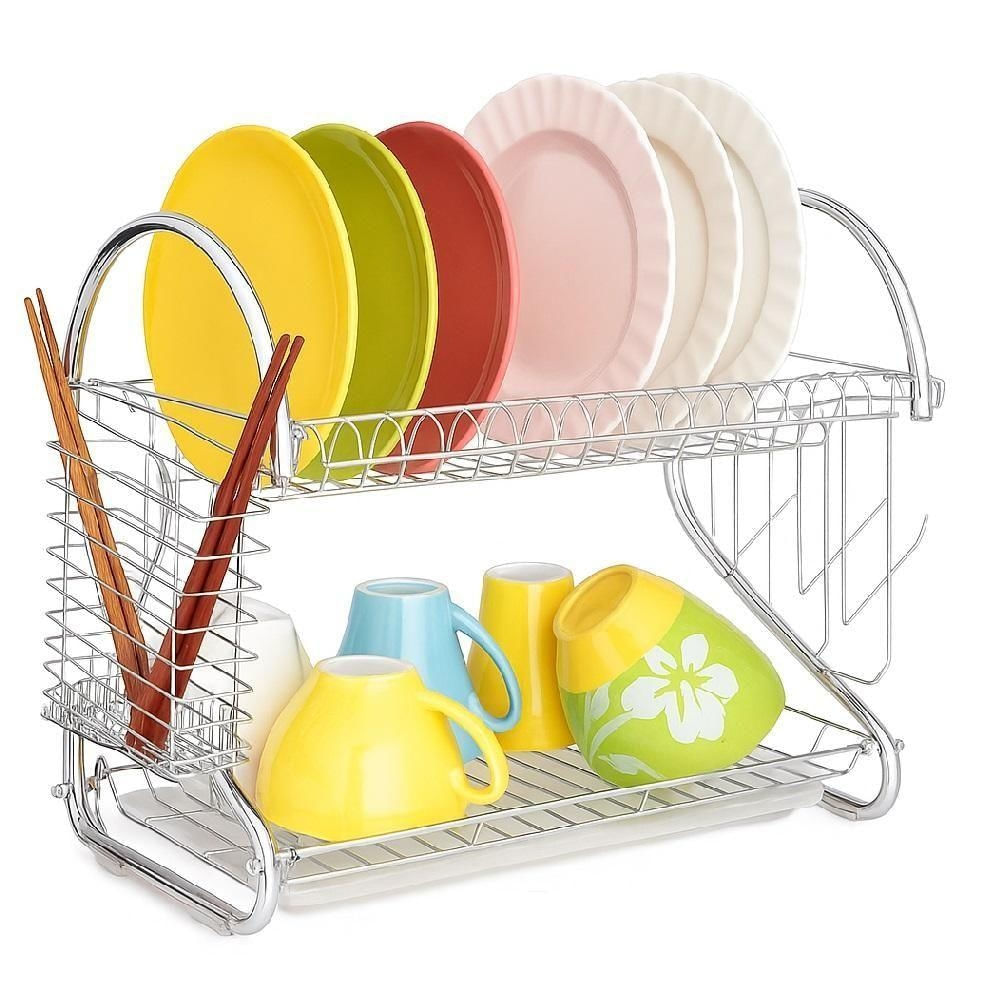Escorredor De Loucas Duplo Cromado Organizador De Pia Armario Bancada Suporte Porta Copo Talheres Prato Desmontavel