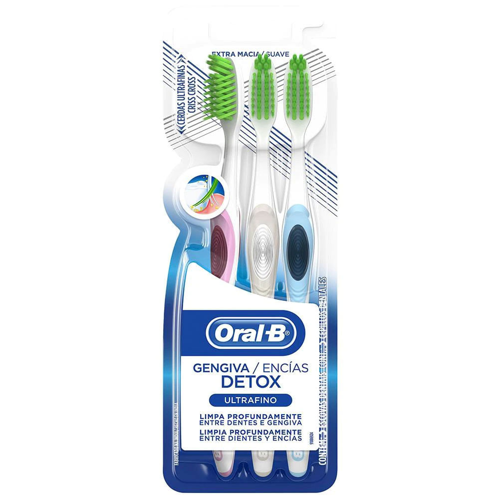 Escova de Dente Gengiva Detox Ultrafino 3 unidades Oral-B Branco com Rosa e Azul