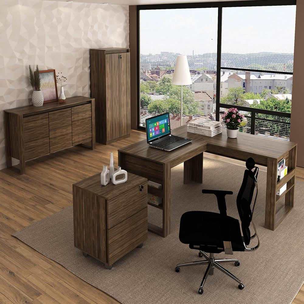 Escritório Completo com Mesa Angular Armário Alto Balcão e Gaveteiro Moon MDP Nogal - Gran Belo Possui amplo espaço, material em MDP, acabamento em BP, costas na cor do móvel. Criativa e imponente a linha Office foi desenvolvida para entregar o que há de mais prático e simples nas rotinas do dia a dia. Surpreendente em suas linhas, entrega tudo o que você precisa.