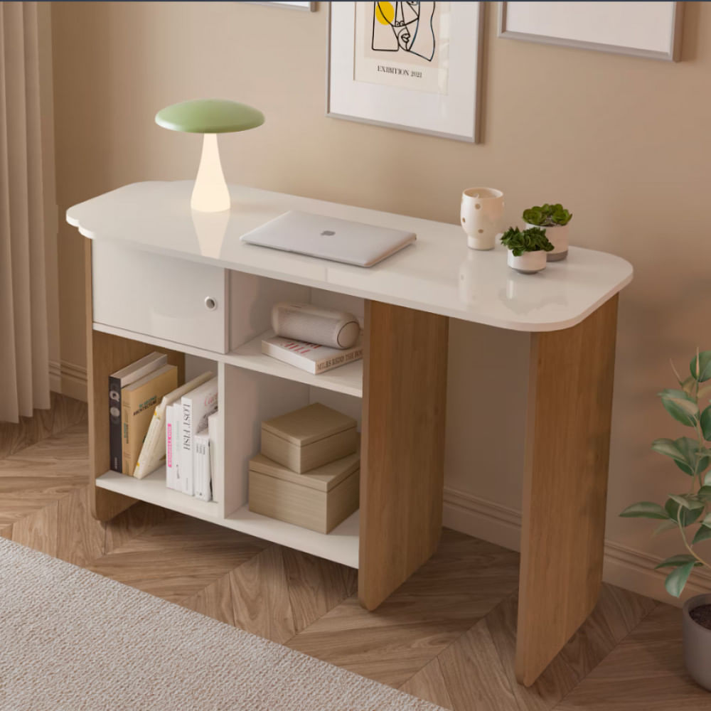 Seu tampo rotativo de 180 graus permite o uso em diferentes configurações: reta, em L ou fechada, garantindo total liberdade de layout. A estrutura multifuncional conta ainda com 4 nichos organizadores e uma porta de correr, oferecendo amplo espaço para armazenar livros, objetos decorativos ou materiais de trabalho.